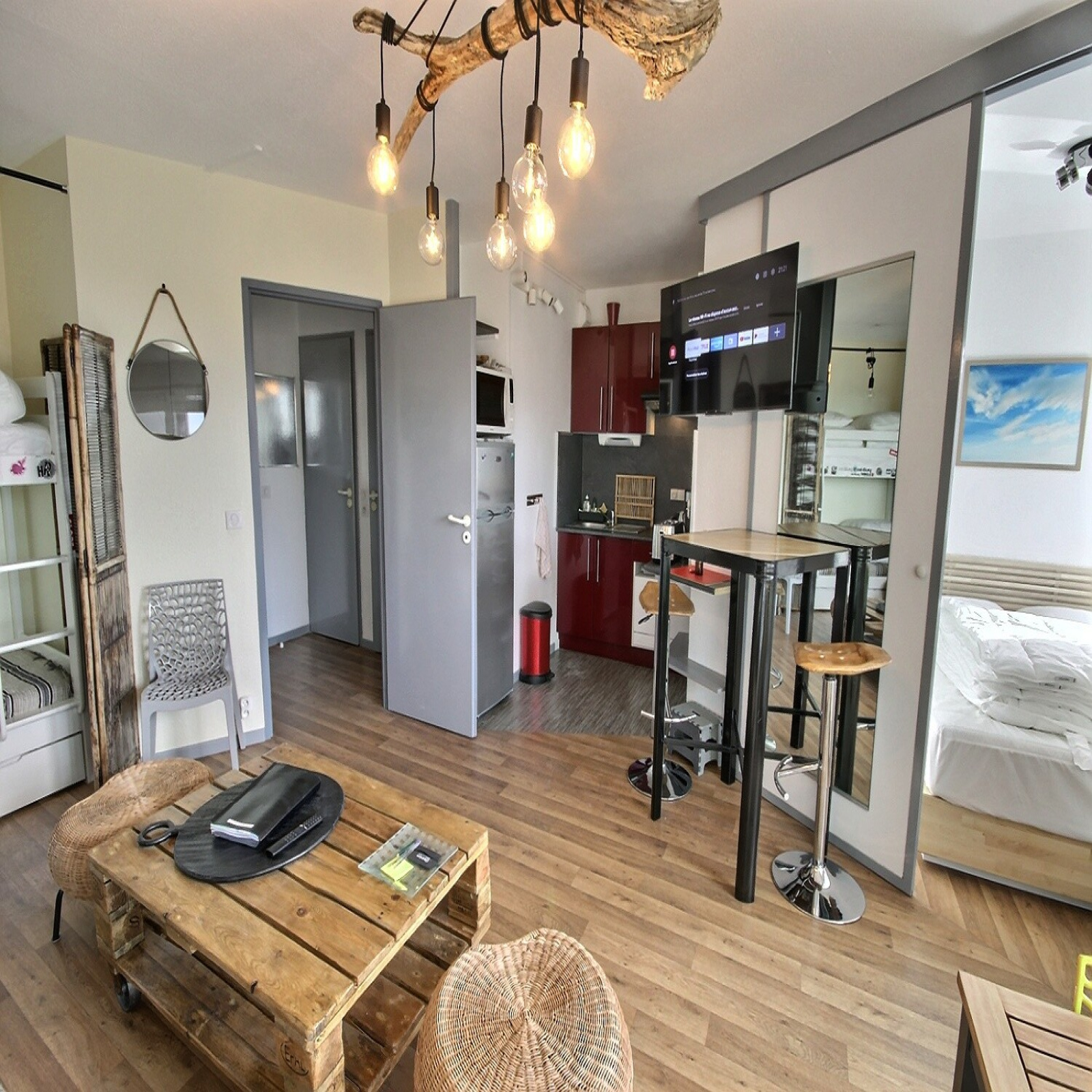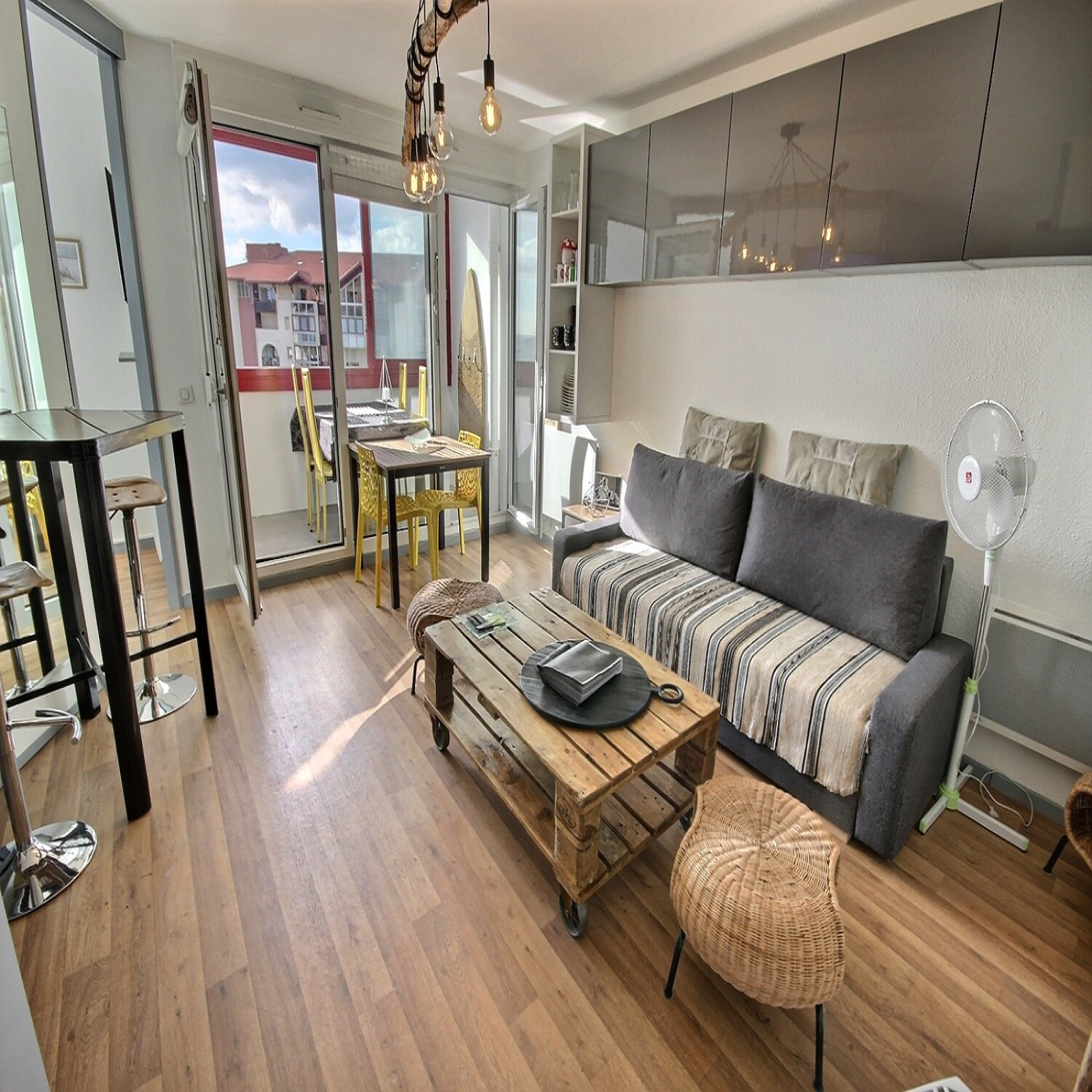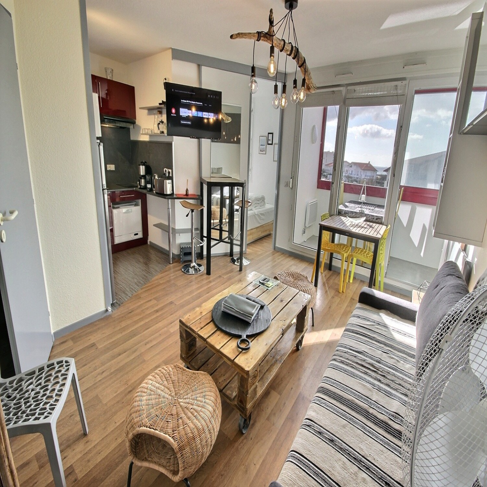 LOCATION DE TOURISME dans les Landes, à Soorts-Hossegor (40150), à proximité des commerces, SPOTS de SURF à la PLAGE Centrale Sud et du centre-ville, PISCINE PRIVEE dans résidence Le Point d'Or, PARKING spacieux (grand SUV possible) intérieur au 1er sous-sol, CELLIER au rez-de-chaussée pour vélos et planches surf, de 2 à 7 couchages, mobilier artisanal ; 2 pièces avec LOGGIA, entièrement refait en 2022 de 42m² au 2ème étage sur 3 avec ASCENSEUR, composé d'une entrée avec placard, séjour spacieux avec canapé convertible 140x200, et TV connectée et Wi-Fi, 3 lits jumeaux d'appoint 90x190, cuisine ouverte entièrement équipée dont lave-vaisselle, 1 CHAMBRE avec lit 160x200 avec placard pan mural, lave-linge séchant et 2ème TV connectée, salle de bains et wc indépendant. Connexion WIFI. Déclaration Mairie N°4030400119379. Annonce professionnelle. Disponibilités et tarifs selon périodes. Contacter Patrick par mail patrick@arc-en-ciel-immo.com.