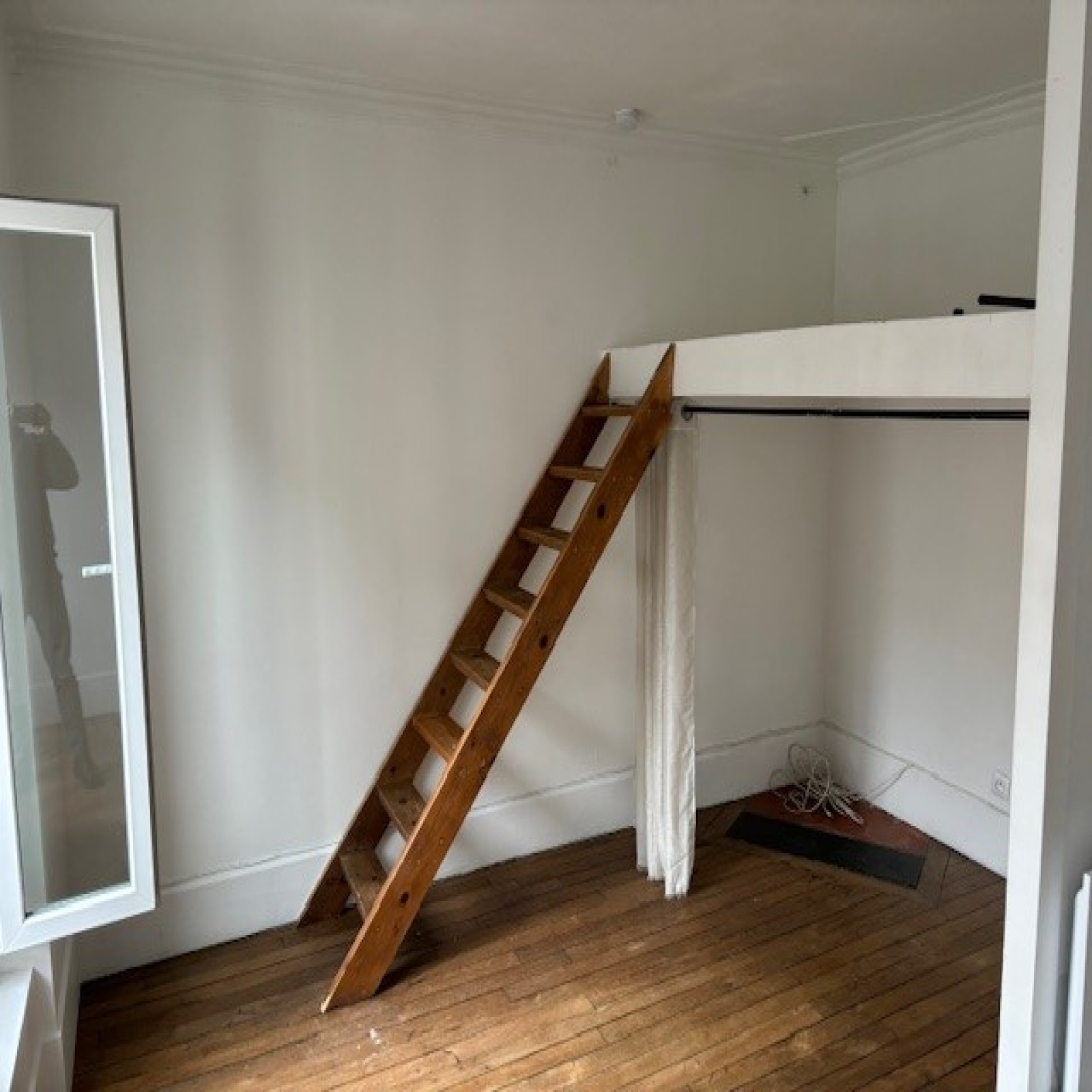 Proche Gare du Nord et Gare de l'Est, rue Saint Quentin, ds immeuble avec gardien, 2 pièces OUVERT TRAVERSANT de 26.95m² habitable loué VIDE au 4ème DERNIER ETAGE lumineux RADIATEURS - BALLON EAU CHAUDE - FENETRES NEUFS + ISOLATION MUR COTE RUE. Composé d'une entrée avec placard-dressing indépendant, séjour, cuisine simple (meubles hauts et bas, évier egouttoir, plan de travail sur pied) en pan mural, espace chambre semi ouvert sur le séjour avec mezzanine en bois et possibilité de mettre literie en haut ou en bas, salle de bains avec fenêtre, petite armoire vitrée de rangement et wc.