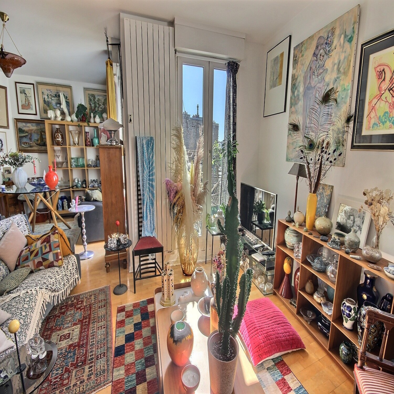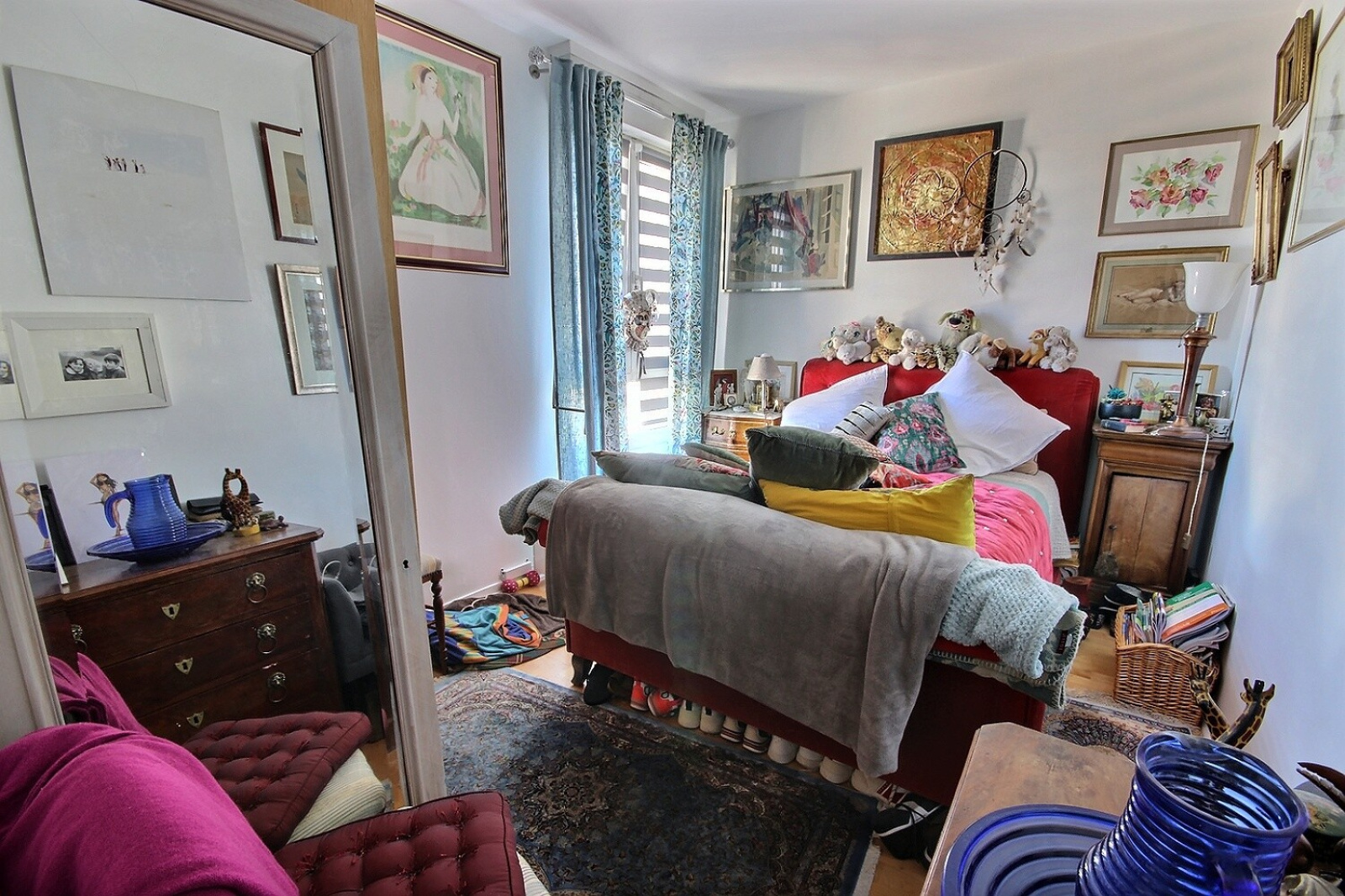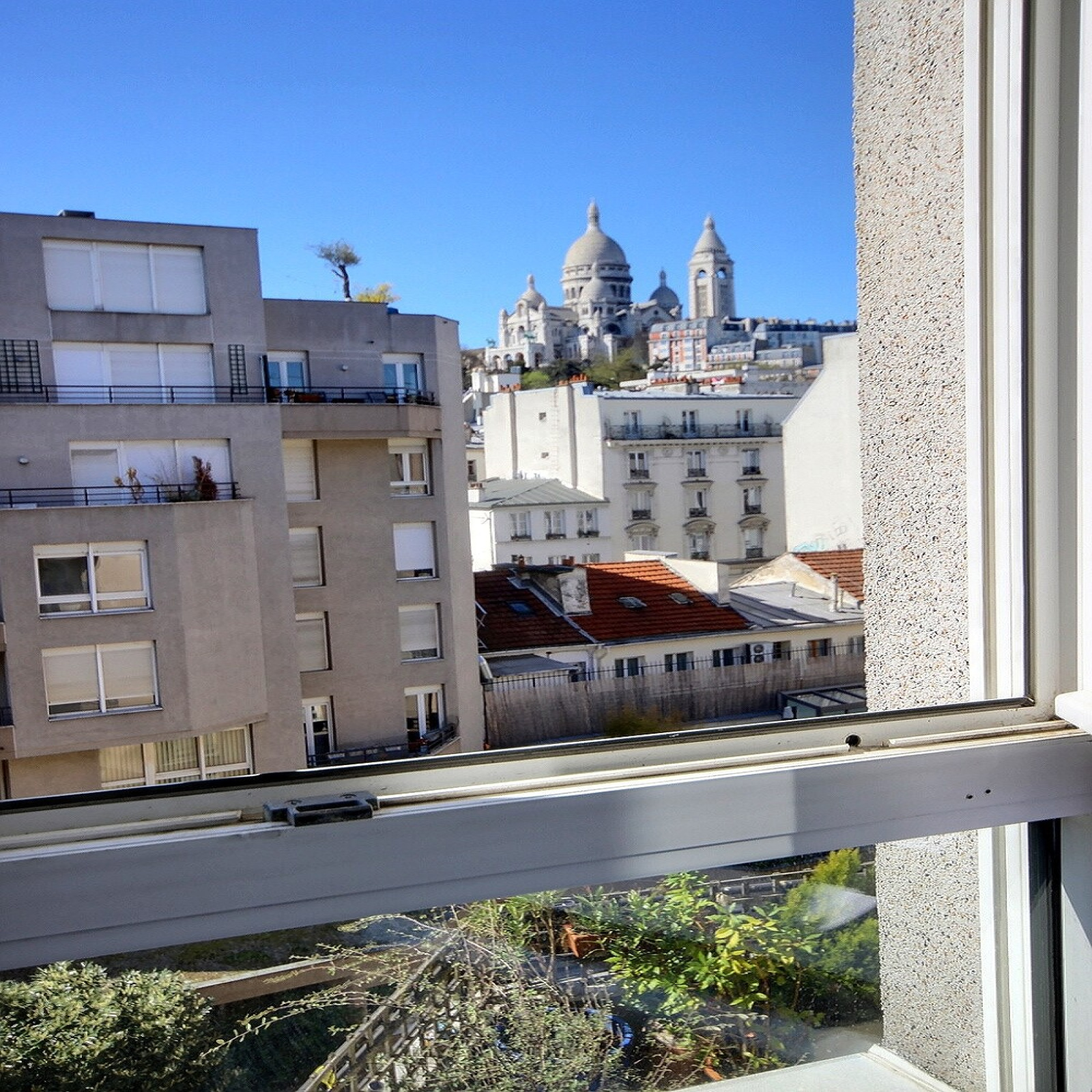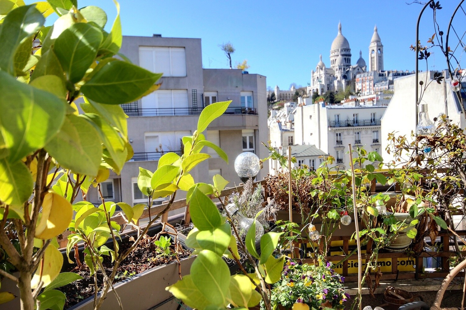 3/4 Pièces + 2 TERRASSES de 5m² EST et 9m² OUEST SUR JARDINS avec vue sur le SACRE-COEUR au 6ème étage avec ascenseur, seul appartement à l'étage, 65m² au sol dont 64,22m² carrez + TERRASSES, comprenant : entrée, séjour double donnant sur la Terrasse Ouest avec Vue, cuisine fermée (pouvant être ouverte sur entrée et séjour pour agrandir) et sa propre terrasse à l'Est, petite buanderie, belle salle d 'eau (ancienne baignoire) avec fenêtre, wc indépendant avec lave-mains, 2 chambres dont une avec placard.