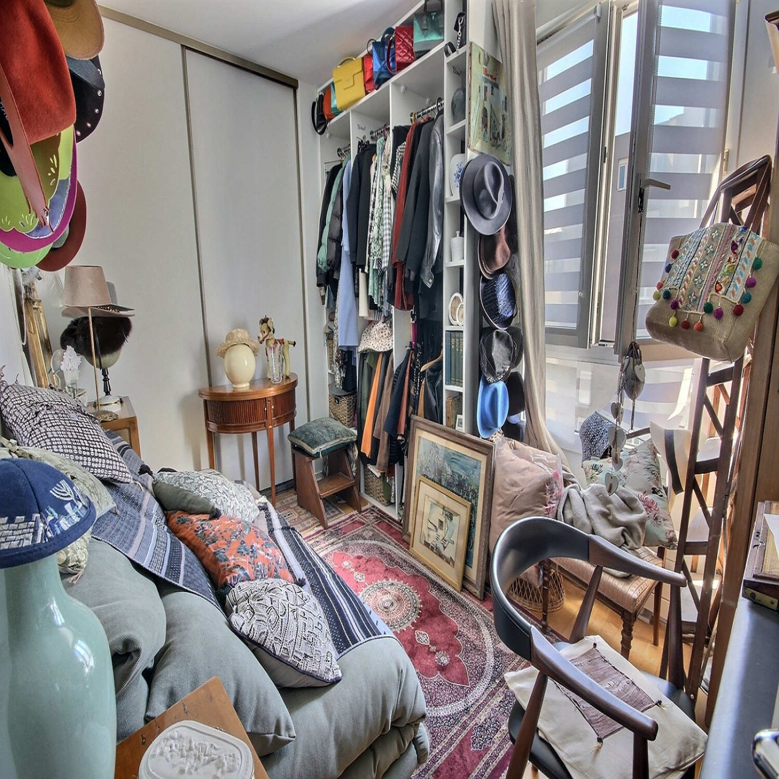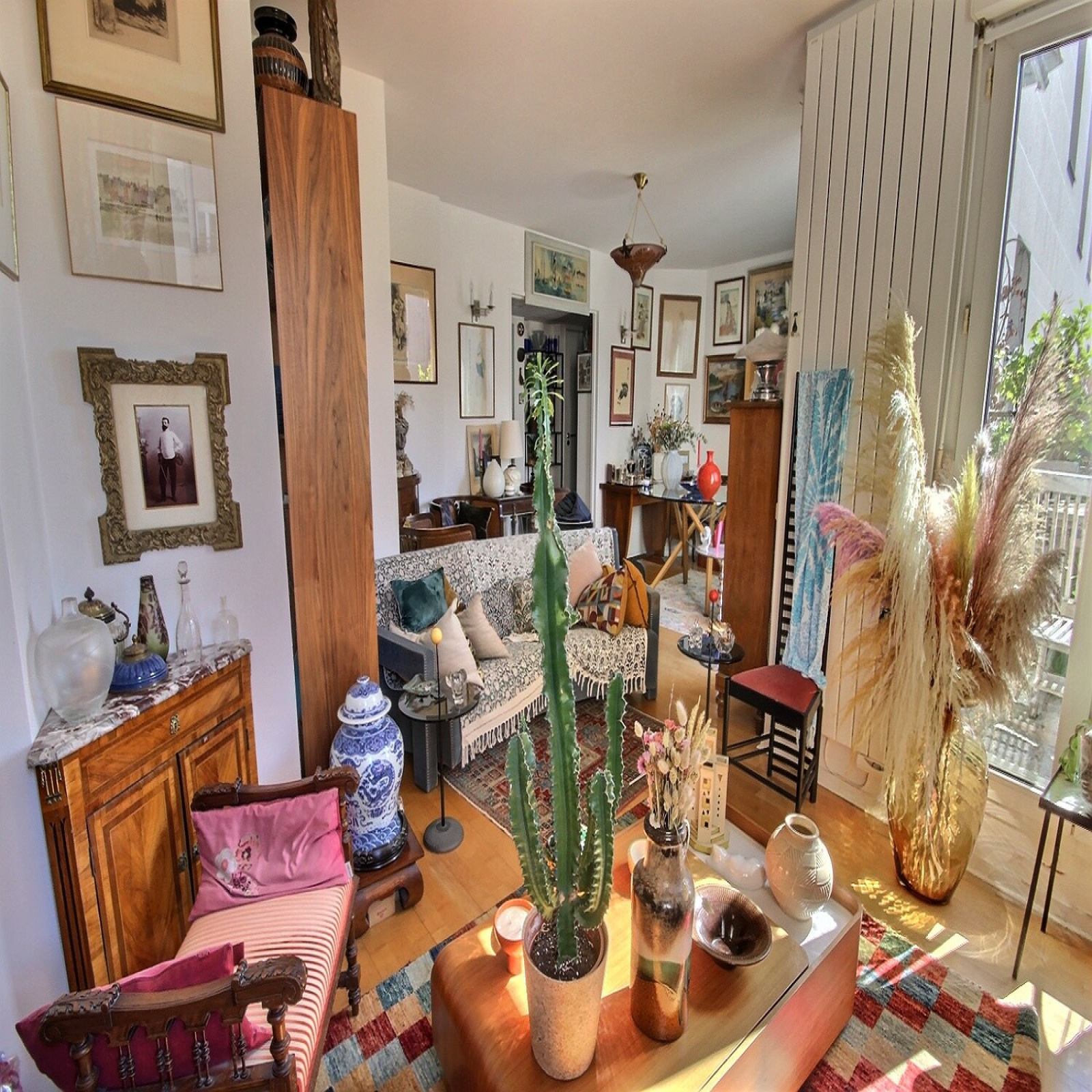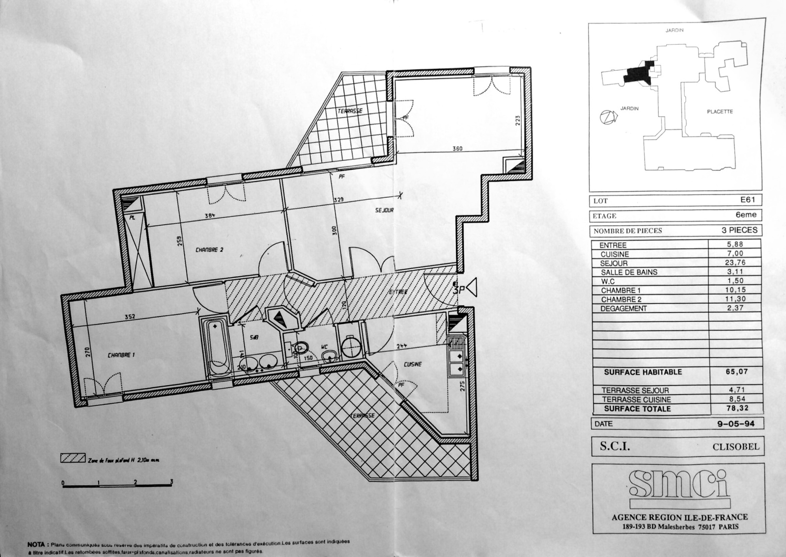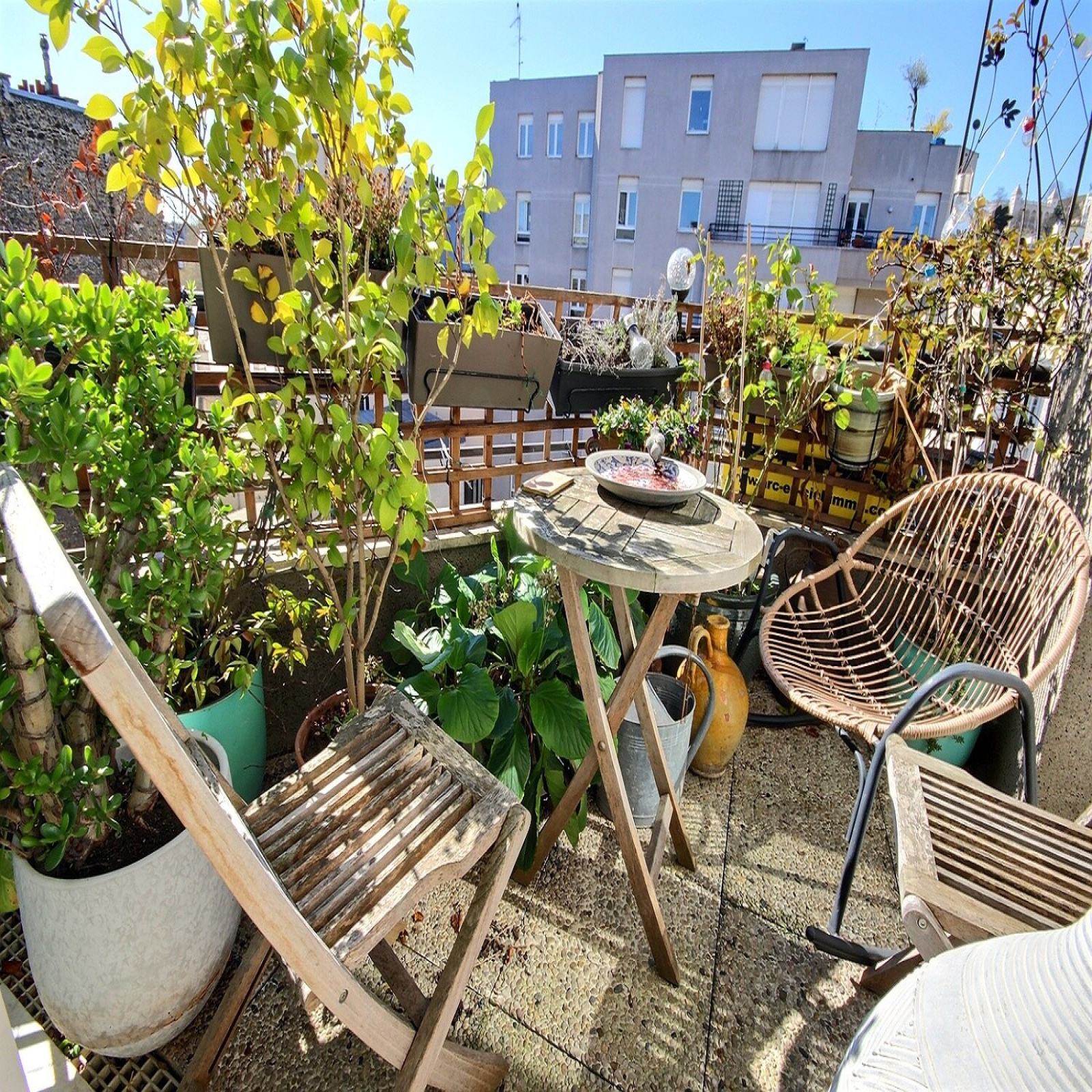 3/4 Pièces + 2 TERRASSES de 5m² EST et 9m² OUEST SUR JARDINS avec vue sur le SACRE-COEUR au 6ème étage avec ascenseur, seul appartement à l'étage, 65m² au sol dont 64,22m² carrez + TERRASSES, comprenant : entrée, séjour double donnant sur la Terrasse Ouest avec Vue, cuisine fermée (pouvant être ouverte sur entrée et séjour pour agrandir) et sa propre terrasse à l'Est, petite buanderie, belle salle d 'eau (ancienne baignoire) avec fenêtre, wc indépendant avec lave-mains, 2 chambres dont une avec placard.