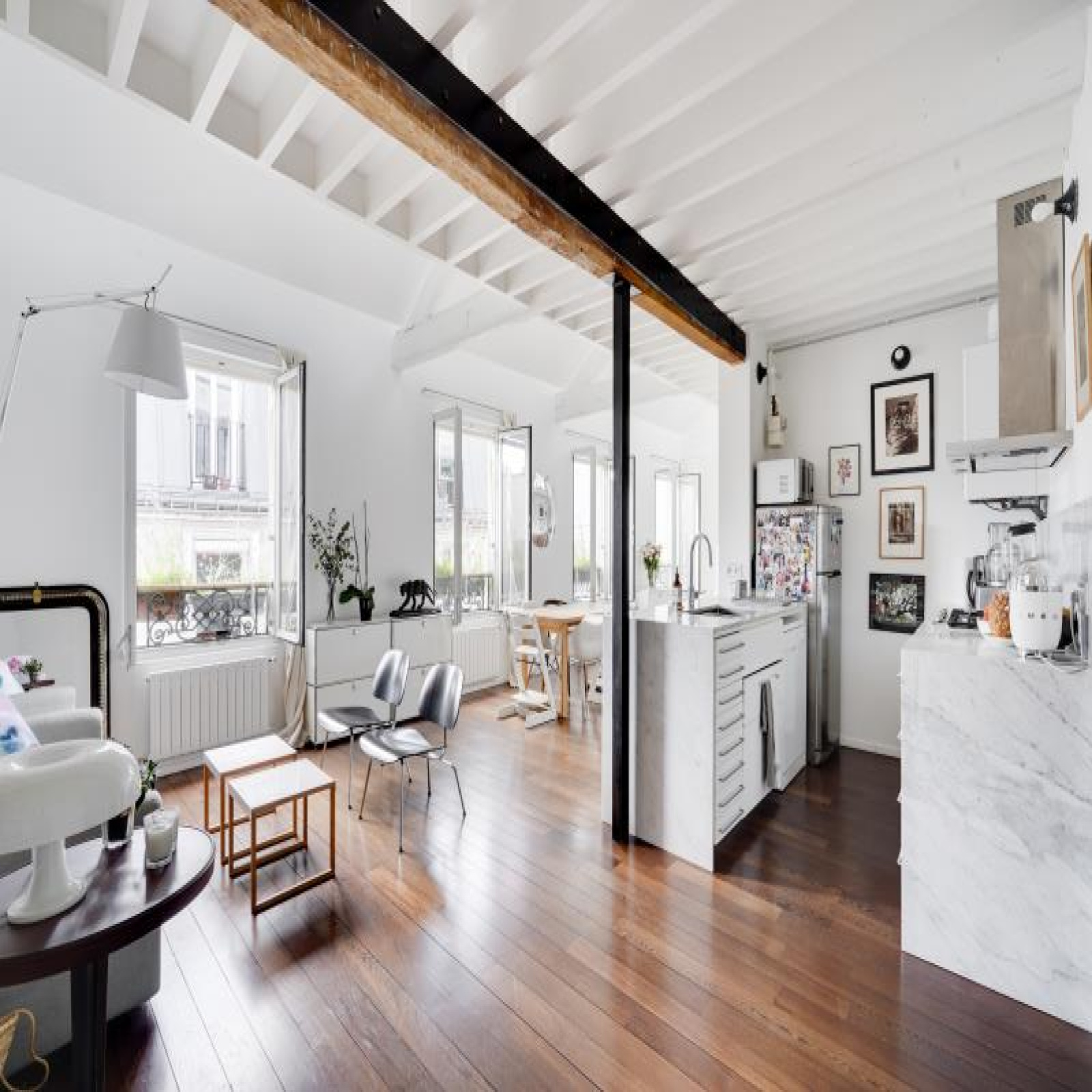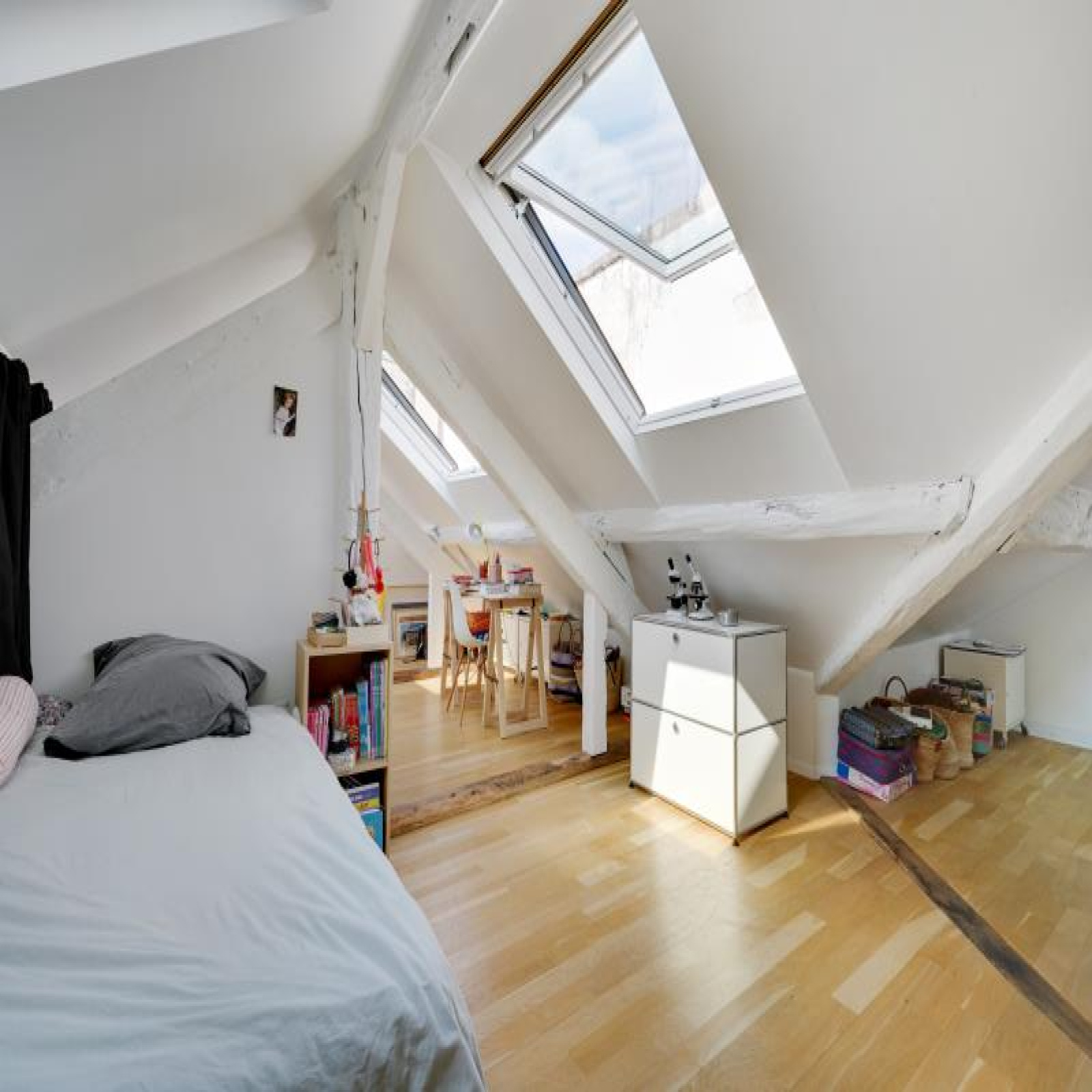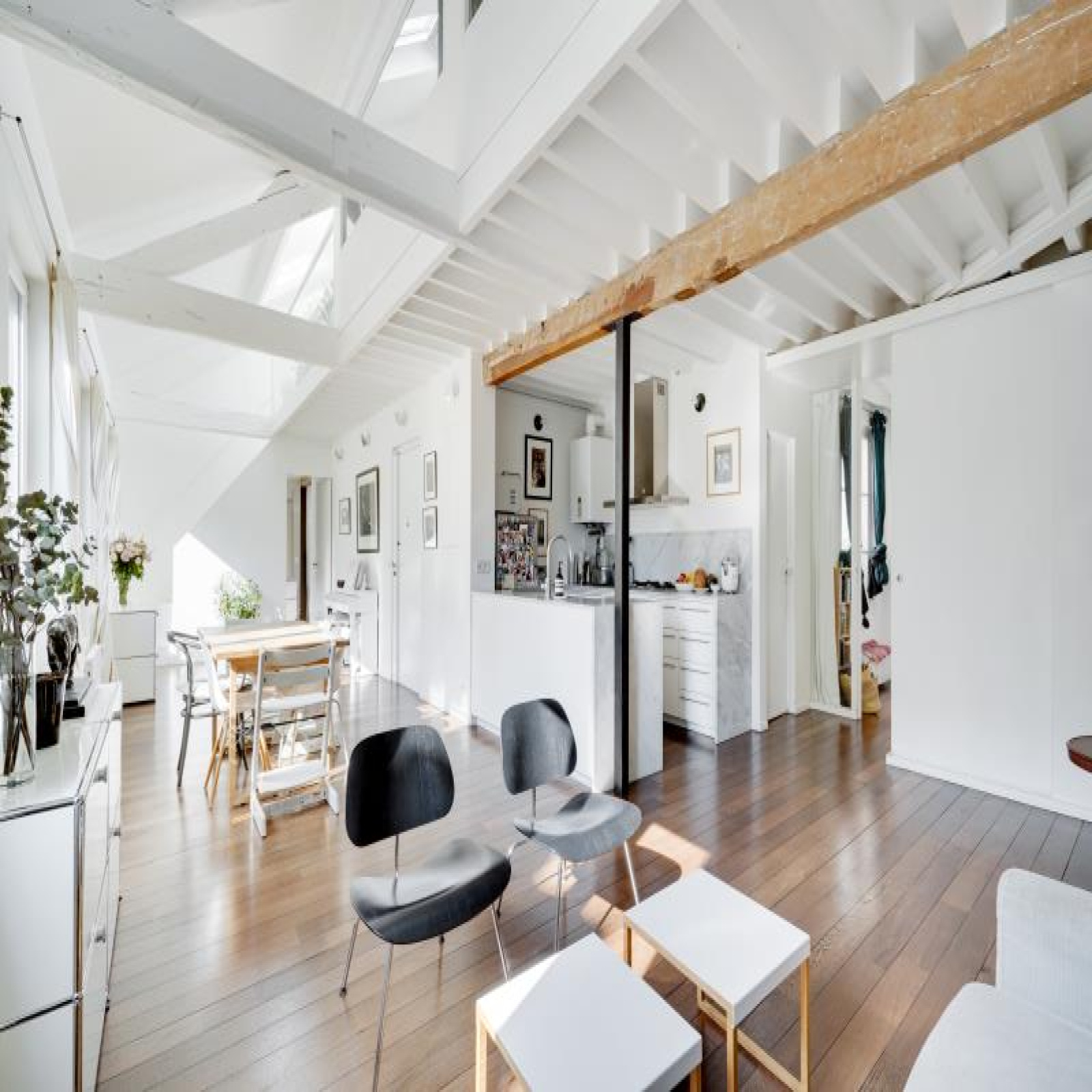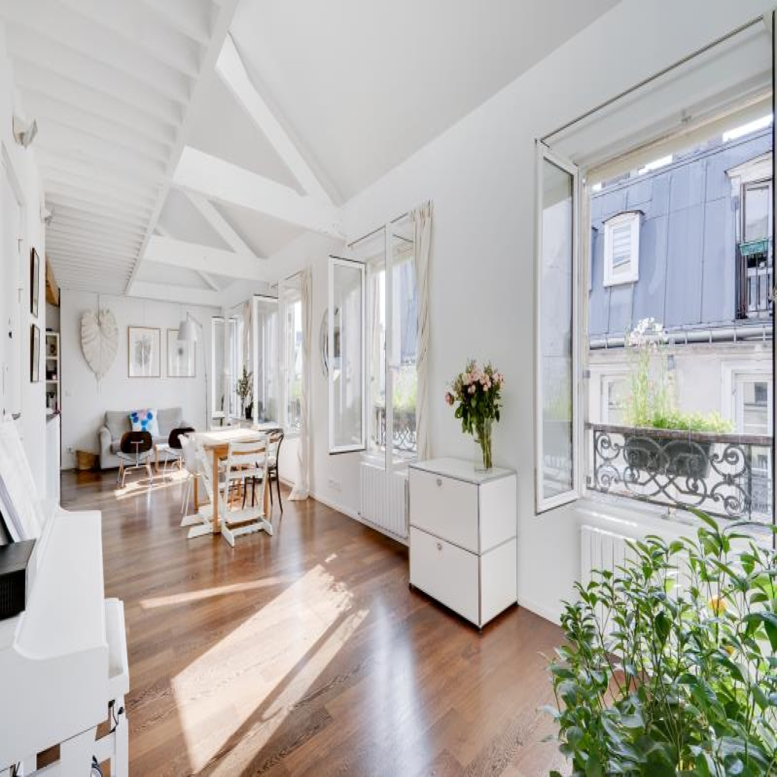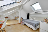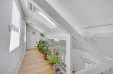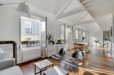 Paris 10ème : DUPLEX "esprit LOFT" avec 3 ou 4 chambres : comme une maison avec vue sur les toits de Paris. 126,53m² au sol, dont 91,39m² Carrez soit 103,10m² pondérés. Beaux VOLUMES. Entièrement réaménagé par architecte (le propriétaire), ce bien d'exception propose au 5ème et dernier étage SANS ascenseur : un vaste séjour CATHEDRALE avec jusqu'à 4,30m de hauteur et 48,20m² bordé par 4 fenêtres double vitrage et oscillo-battantes à l'Ouest, cuisine équipé à l'américaine, le niveau bas du duplex accueille également une belle chambre, 2 salles de bains avec 2 wc et fenêtres, un dressing et de nombreux rangements.~A l'étage sous les toits, un bureau/petite chambre, une galerie en mezzanine et une grande chambre (éventuellement divisible)...~Lumière à toute heure par sa triple exposition avec 7 fenêtres et 8 velux ; CALME absolu, entièrement sur cour. Parfait état, PLAN MODULABLE (agrandir séjour, 3ème sde, etc.). FIBRE. L'ensemble est constitué avec des matériaux nobles : parquets massifs, marbre de Carrare pour la cuisine et sdb. Chauffage individuel au gaz à condensation. Très bonne isolation thermique et phonique, porte blindée 7 points Torjman, stores à projection Roussel, gardien vidéo-surveillance.~Cellier d'étage et 2 caves attenantes.~Quartier des 2 gares (Nord et Est), St Vincent de Paul, Faubourg St Denis. Marché St Quentin.