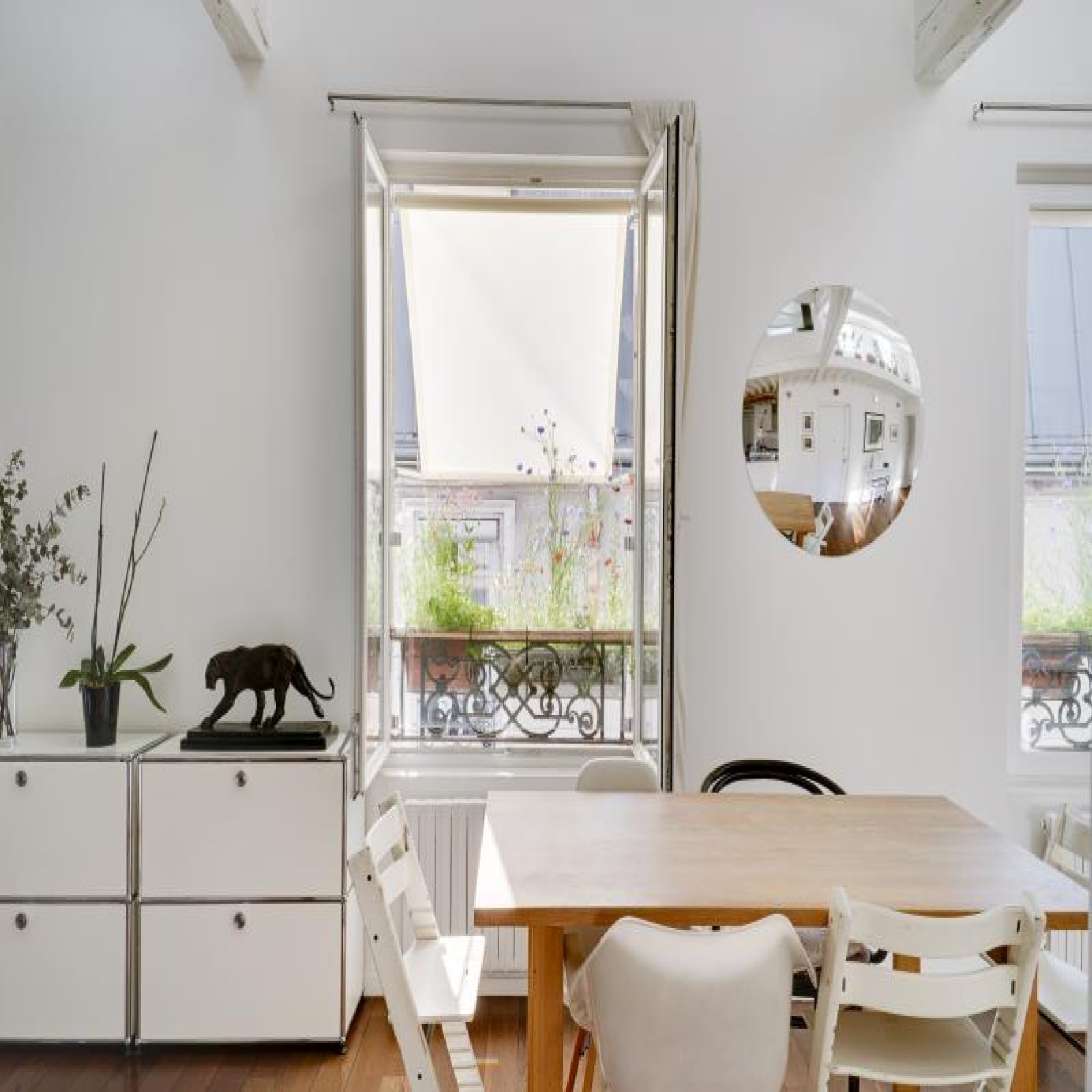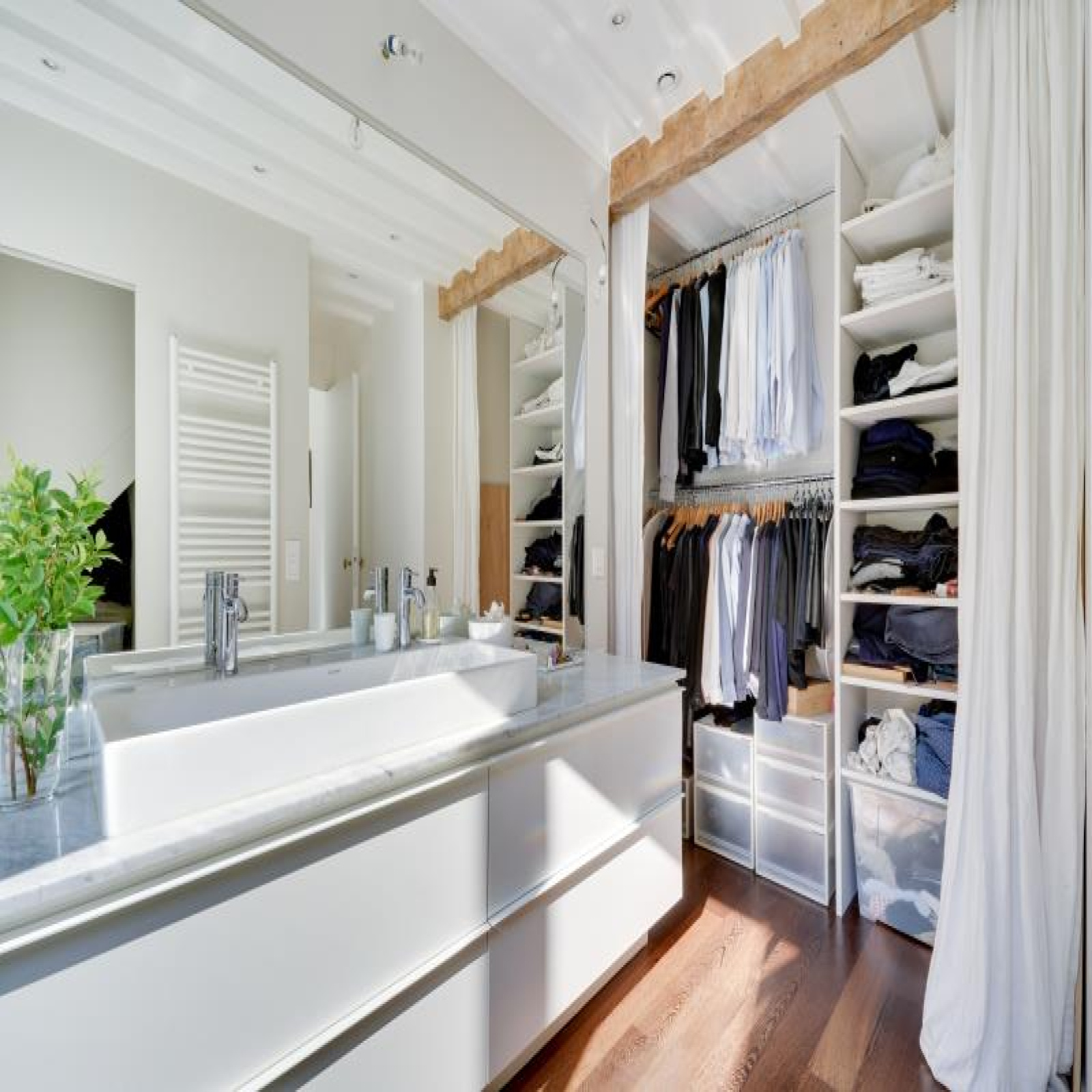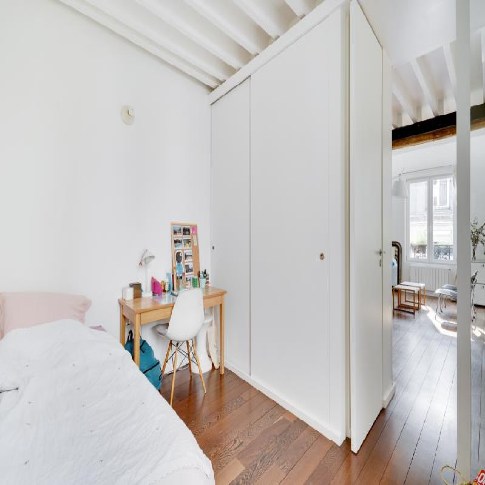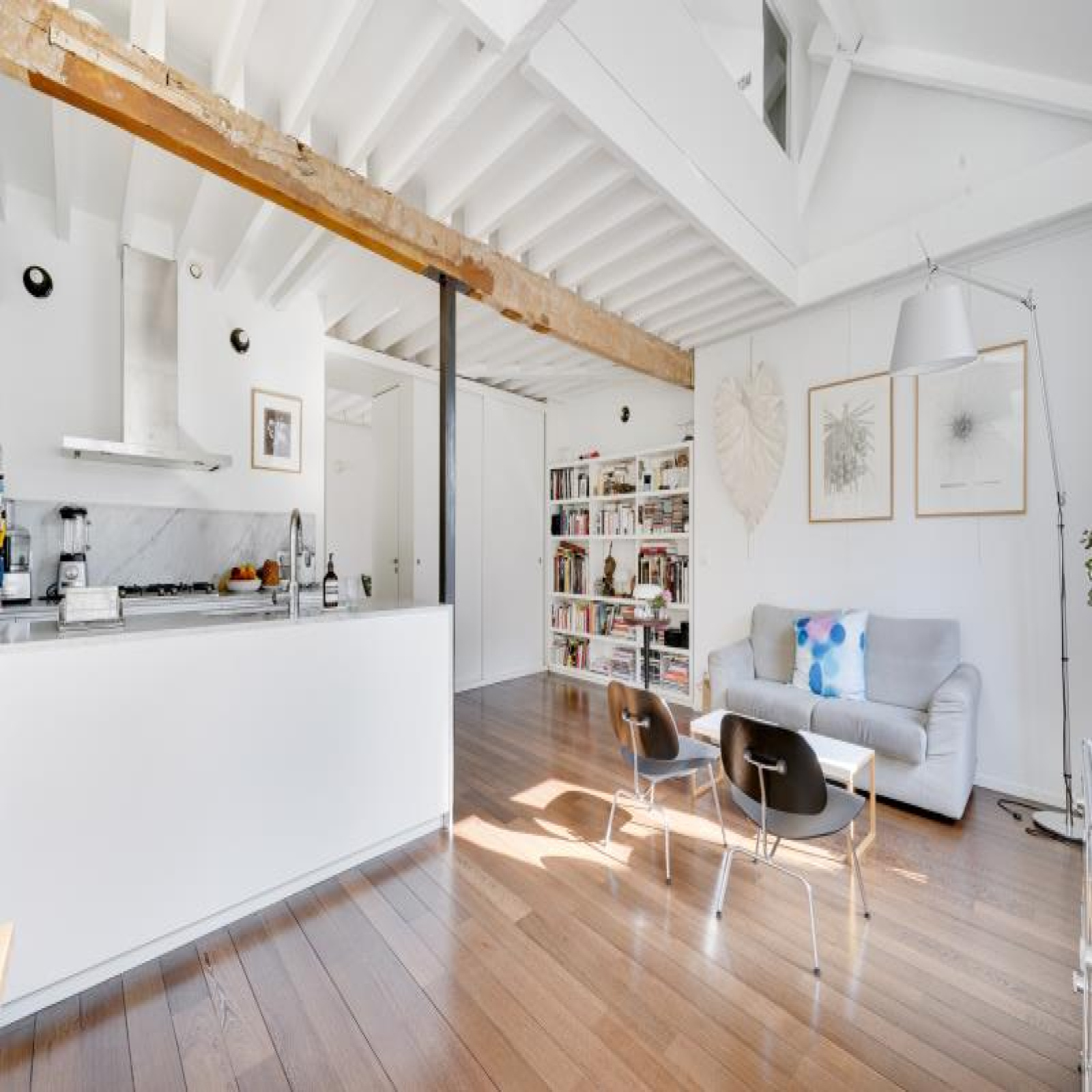 Paris 10ème : DUPLEX "esprit LOFT" avec 3 ou 4 chambres : comme une maison avec vue sur les toits de Paris. 126,53m² au sol, dont 91,39m² Carrez soit 103,10m² pondérés. Beaux VOLUMES. Entièrement réaménagé par architecte (le propriétaire), ce bien d'exception propose au 5ème et dernier étage SANS ascenseur : un vaste séjour CATHEDRALE avec jusqu'à 4,30m de hauteur et 48,20m² bordé par 4 fenêtres double vitrage et oscillo-battantes à l'Ouest, cuisine équipé à l'américaine, le niveau bas du duplex accueille également une belle chambre, 2 salles de bains avec 2 wc et fenêtres, un dressing et de nombreux rangements.~A l'étage sous les toits, un bureau/petite chambre, une galerie en mezzanine et une grande chambre (éventuellement divisible)...~Lumière à toute heure par sa triple exposition avec 7 fenêtres et 8 velux ; CALME absolu, entièrement sur cour. Parfait état, PLAN MODULABLE (agrandir séjour, 3ème sde, etc.). FIBRE. L'ensemble est constitué avec des matériaux nobles : parquets massifs, marbre de Carrare pour la cuisine et sdb. Chauffage individuel au gaz à condensation. Très bonne isolation thermique et phonique, porte blindée 7 points Torjman, stores à projection Roussel, gardien vidéo-surveillance.~Cellier d'étage et 2 caves attenantes.~Quartier des 2 gares (Nord et Est), St Vincent de Paul, Faubourg St Denis. Marché St Quentin.