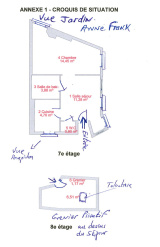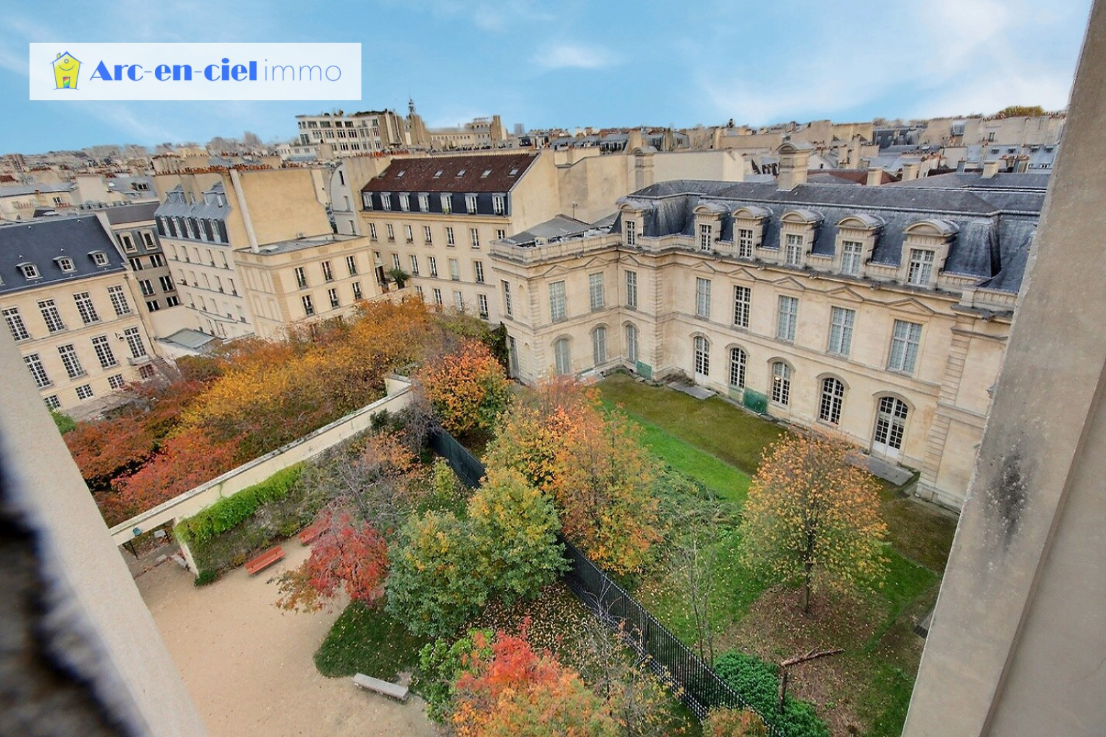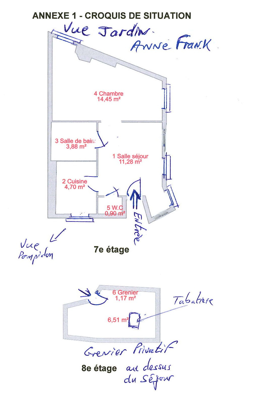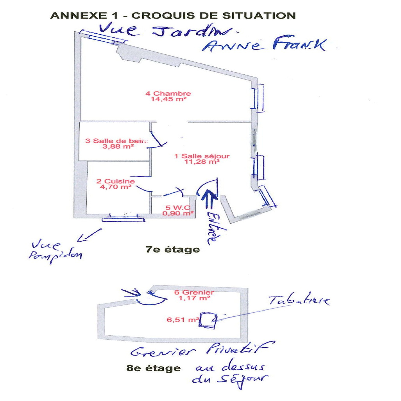 Cité Noël, accès rue Rambuteau au 7ème étage avec ascenseur, ce 2 pièces de 36,38m² pondéré dont 35.21m² Carrez + grenier privatif (environ 7m² au sol dont 1,17m à plus de 1.80m de hauteur avec "tabatière"), VUE SUR JARDIN ANNE FRANK, Hôtels Particuliers et vue panoramique sur Paris. Habitable en l'état ou à rénover, il comprend actuellement un séjour avec 2 fenêtres, une cuisine avec vue sur le Centre Culturel Pompidou, une grande chambre avec 2 fenêtres, une grande salle de bains avec bidet et un wc séparé. Plan modulable dont plusieurs solutions d'aménagement, mais il est facile d'agrandir le séjour avec vue sur jardins, réduire la chambre et la salle de bains. Et pourquoi pas demander à la copropriété l'autorisation de casser une partie du plafond du séjour qui est le plancher du grenier privatif pour faire un beau volume et un appartement de caractère... double vitrage, bons radiateurs radians, ballon d'eau chaude thermodynamique, mais il reste à isoler plafond et murs pour améliorer le DPE. Immeuble avec gardienne.