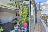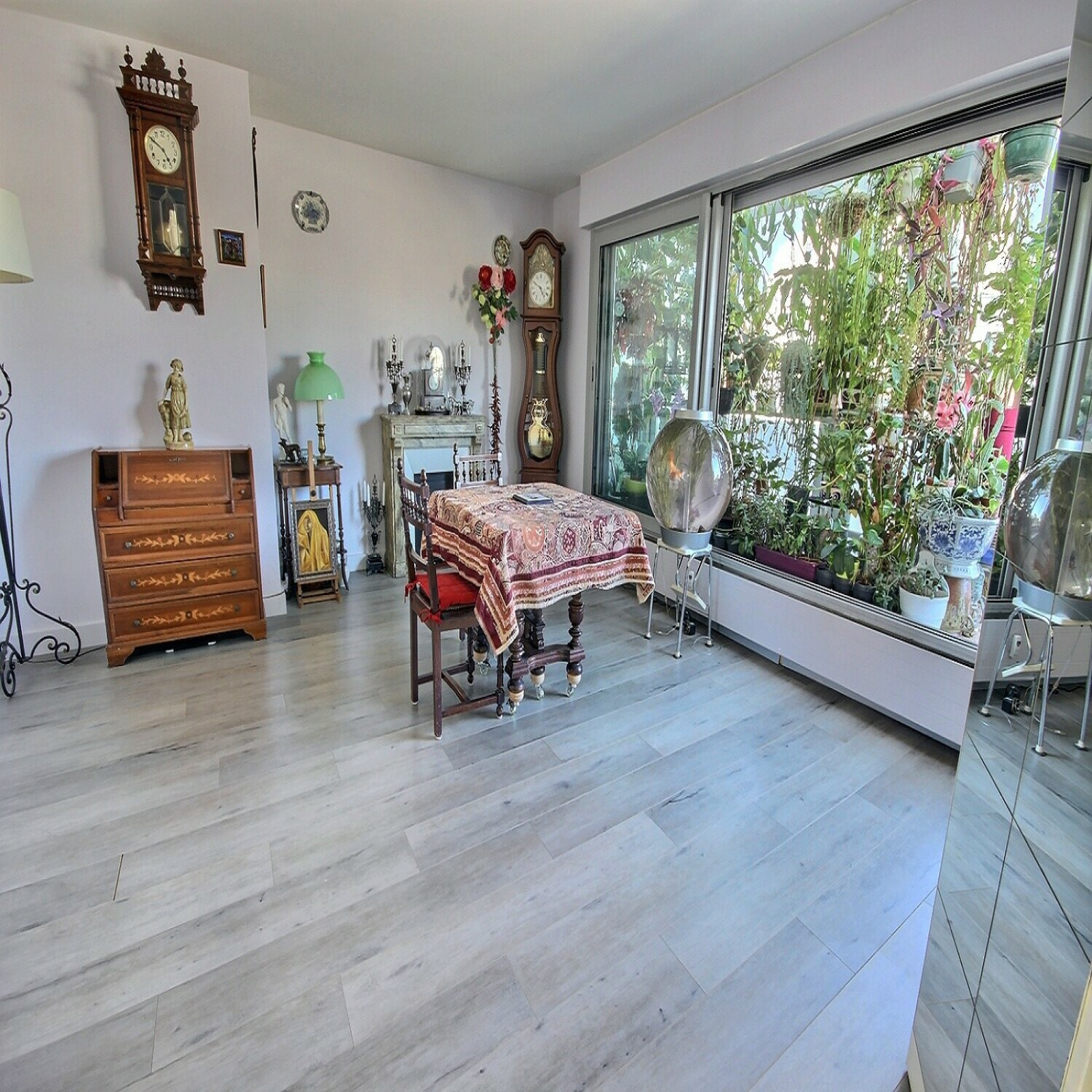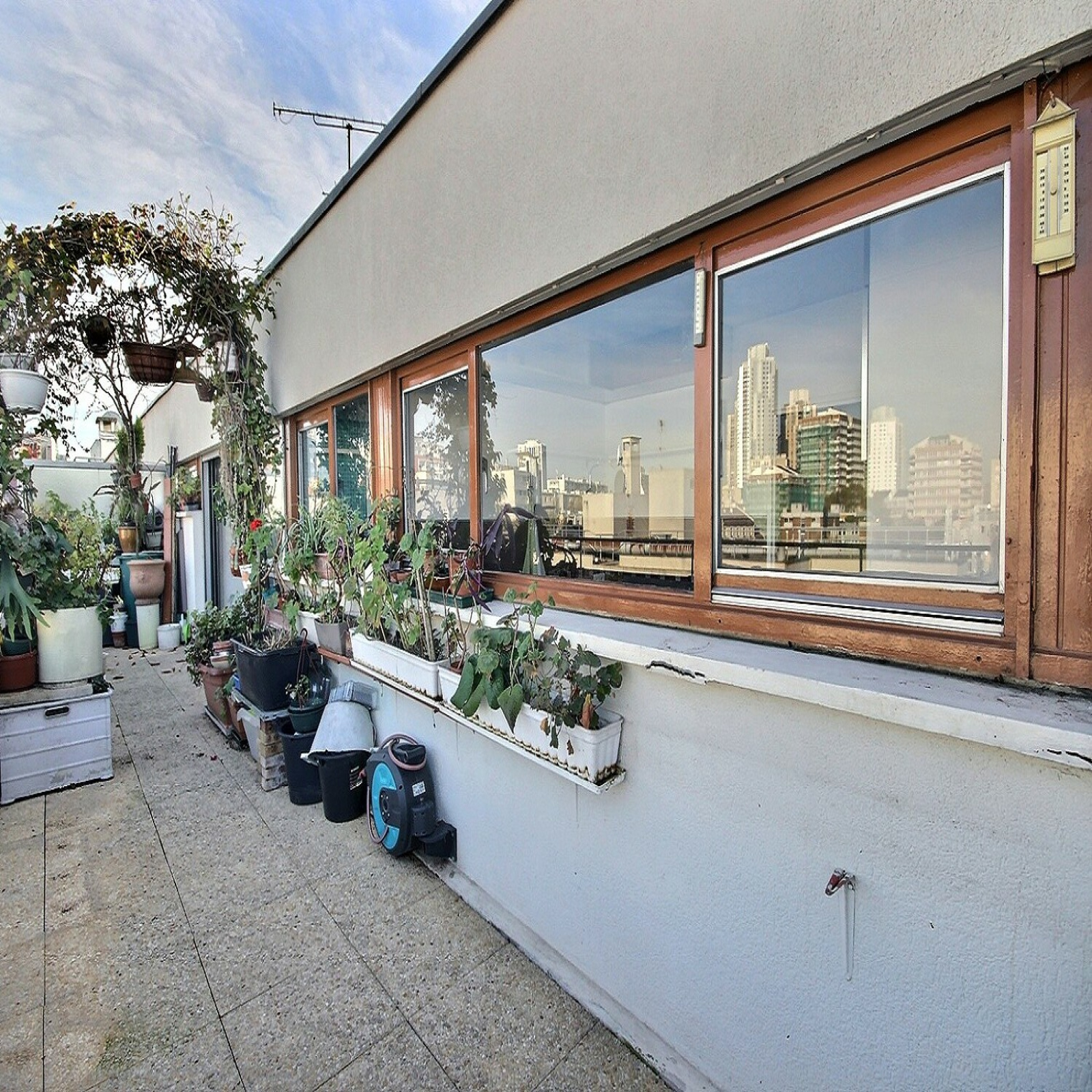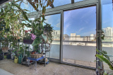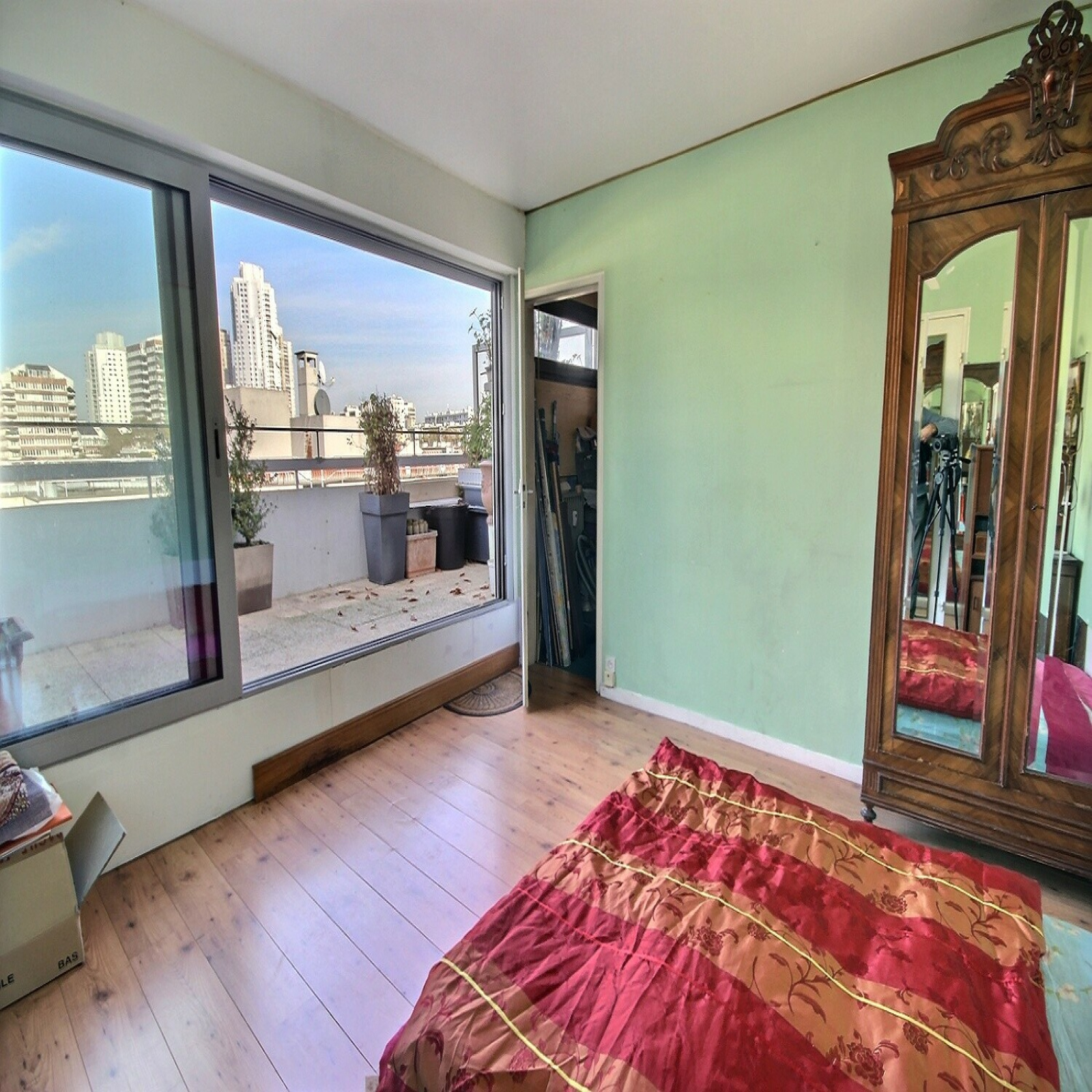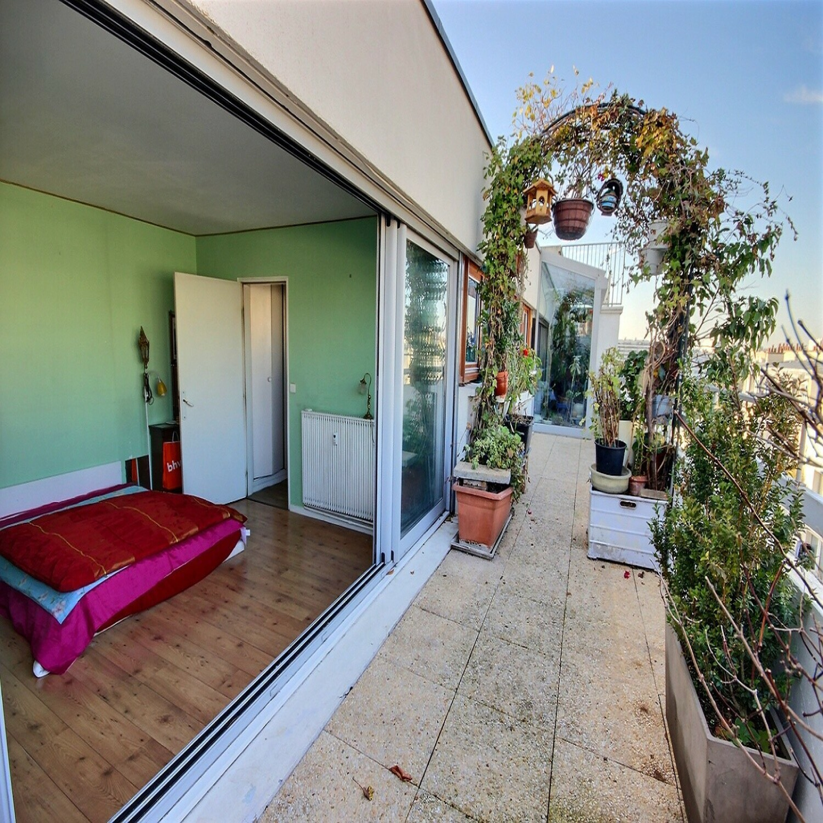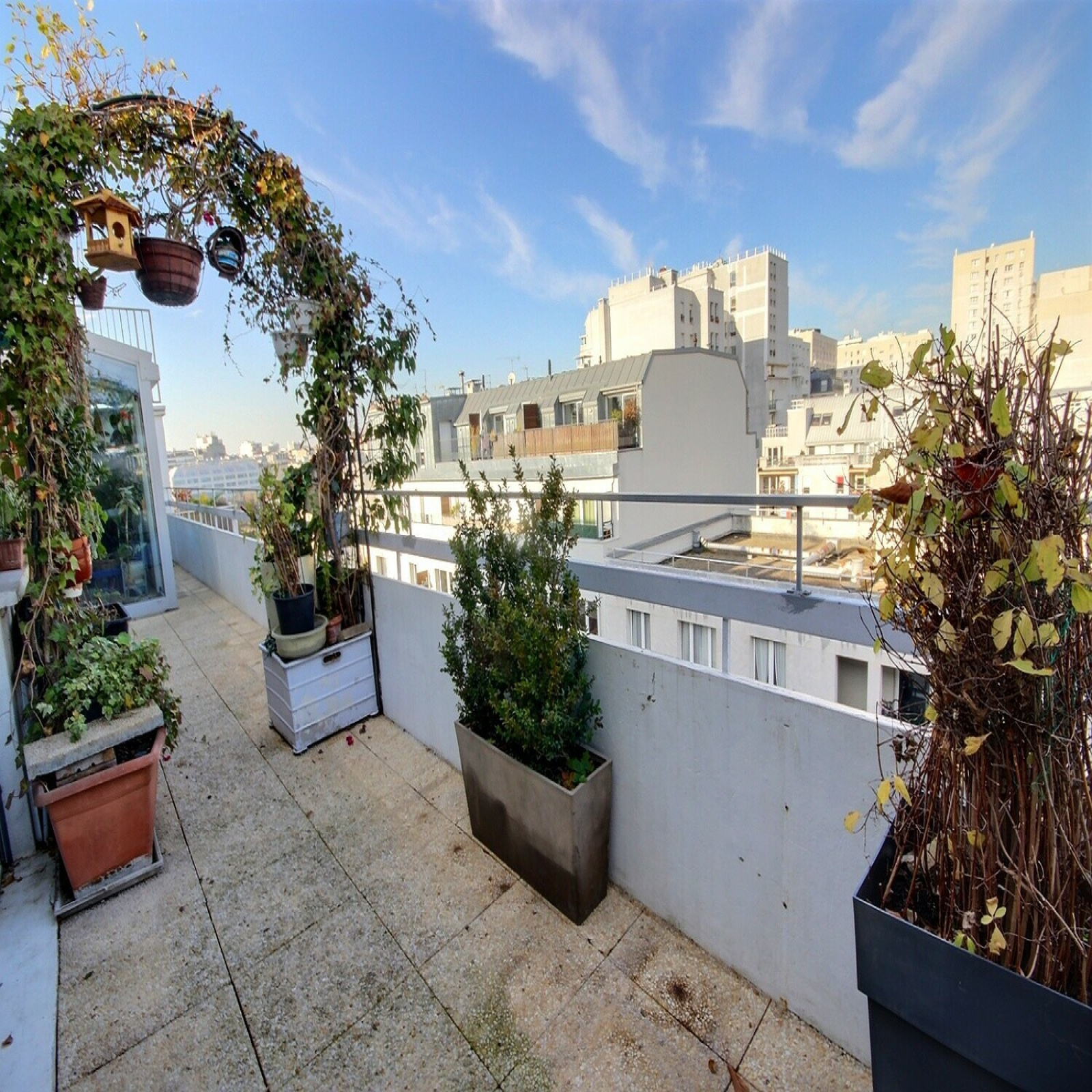 Paris 19ème : 6ème et DERNIER ETAGE AVEC ASCENSEUR jusqu'au 5ème étage + TERRASSE de 28,61m² à l'Est pour ce très grand 2 pièces de 64,94m² habitable avec la véranda dont 58,40m² Carrez (sans la véranda). comprenant : séjour de 22m² donnant sur la terrasse avec VERANDA vitrée double vitrage, cuisine équipée moderne de 6,56m² donnant sur la terrasse, grande chambre de 14,38m² avec dressing de 4m² donnant aussi sur la terrasse, salle de bains avec fenêtre et place pour lave-linge et émaux de Briard, wc séparé et placards. volets roulants électriques neufs, double vitrage de qualité, chauffage collectif par radiateur bas, porte blindée... dans bon immeuble bien isolé de 1976, comme un "Penthouse" sur le toit d'un immeuble. Rue du Maroc, à 2 pas d'un Jardin, stades et métro Stalingrad. Bien exceptionnel. 1 cave. Option possible d'un box fermé 16,16m² pour 30.000 €.