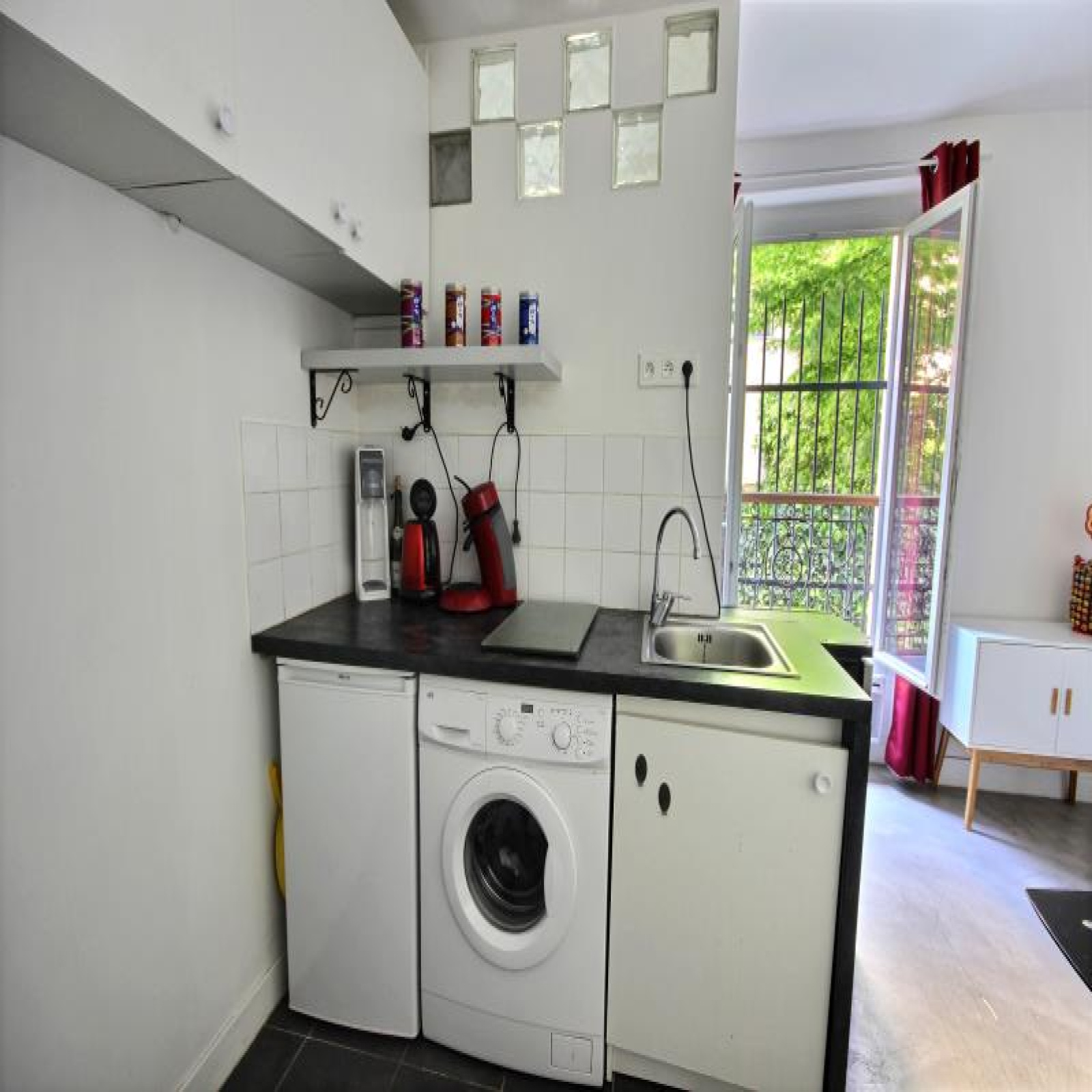 Paris 18ème, métro Chateau Rouge, au 1er étage sur cour-jardin au grand calme à l'Est d'un immeuble ravalé récemment et cage d'escalier votée et payée à charge du vendeur. Très beau 2 pièces de 25m² Carrez, RATIONNEL, en très bon état, comprenant : entrée, séjour, cuisine ouverte, belle chambre, salle d 'eau avec fenêtre oscillo-battante et wc. Refait à neuf récemment, fenêtres double-vitrages, sol en béton ciré, porte chambre coulissante. Barreaux inuttiles aux fenêtres mais d'origine (les voisins ont retiré les leurs). Faibles charges car syndic bénévole. Idéal pour Primo-accédants, investisseurs, pied à terre, etc. Quartier très animé mais appartement au calme, tous commerces, marchés aux poissons et métro à proximité.~Copropriété : X lots dont Y lots principaux. Quote-part budget prévisionnel annuel : 980€. Classe B. Prix affiché honoraires inclus à 3,75% TTC.