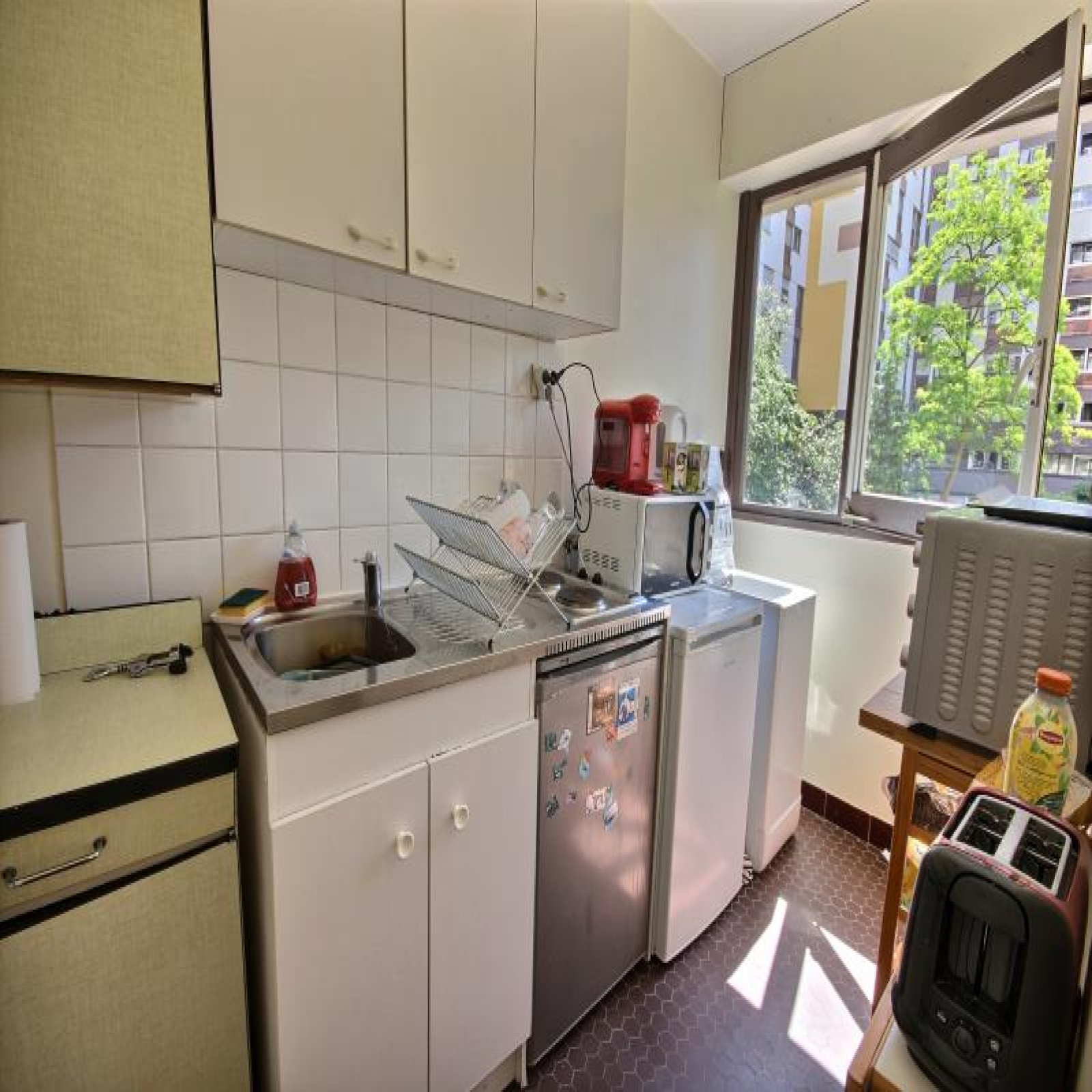 Rue des Pyrénées proche métro Maraichers. Grand studio rationnel de 31m² au 1er étage sur jardin, très ensoleillé, sans vis à vis direct et très calme dans bon immeuble de standing 1974. Comprenant : Entrée avec grands placards, séjour avec parquet et baies vitrées, cuisine séparée avec fenêtre, salle de bains avec baignoire et bidet. WC séparé. Bon état général. 1 cave. Idéal, pour 1er achat, investisseurs, etc. Possibilité de racheter meubles.~Copropriété : 543 lots dont 510 lots principaux. Quote-part budget prévisionnel annuel : 1341€. Classe d'énergie D. Prix affiché honoraires inclus à 3,82% TTC.
