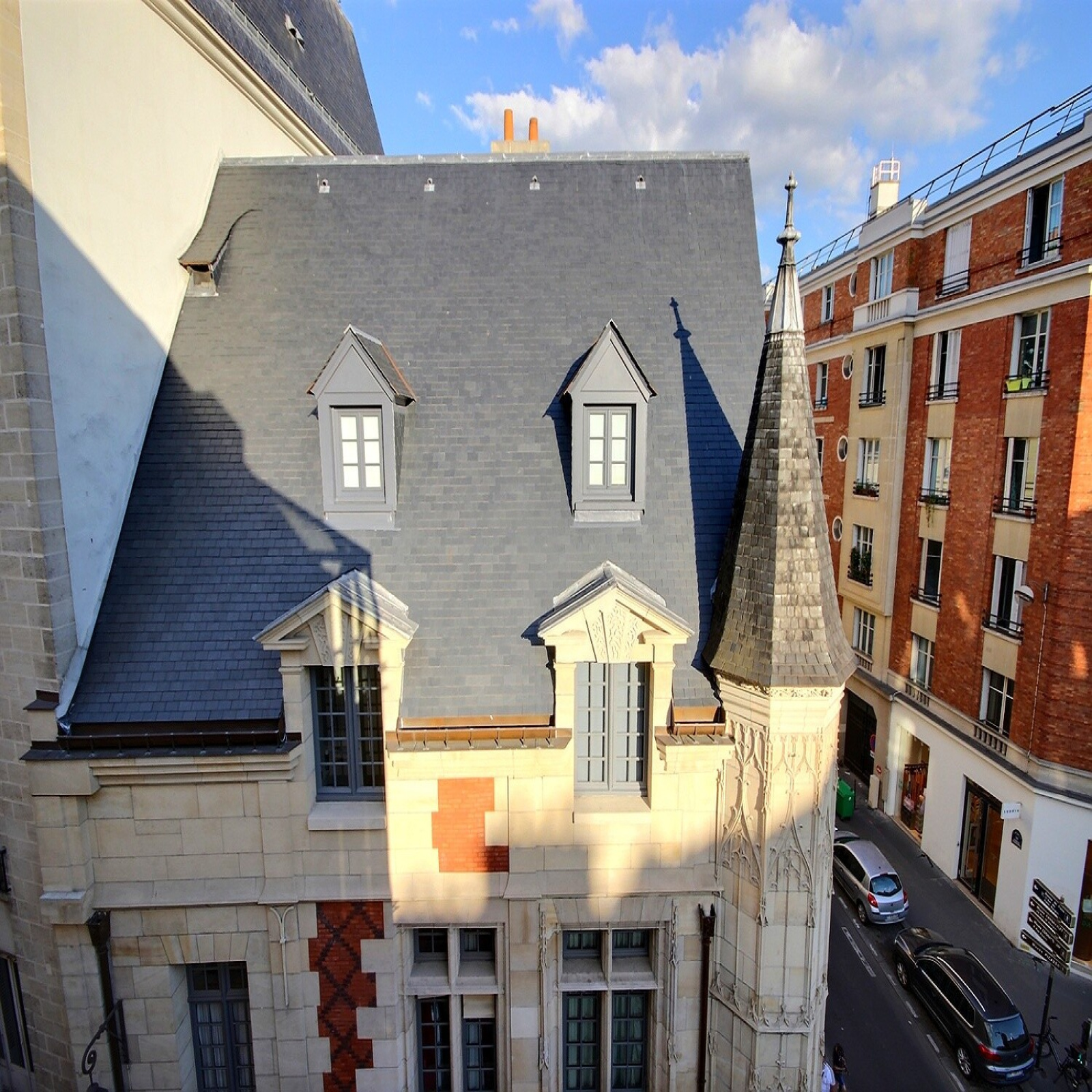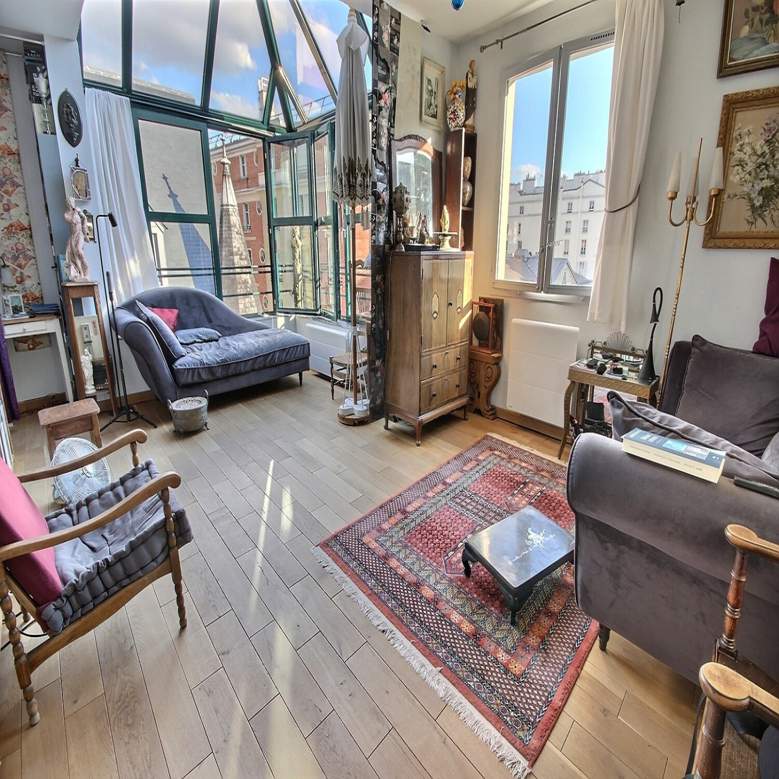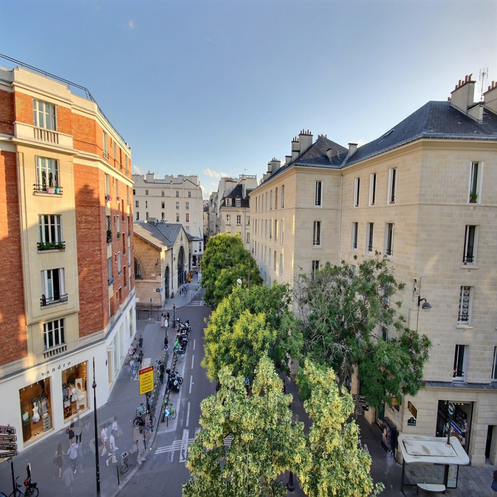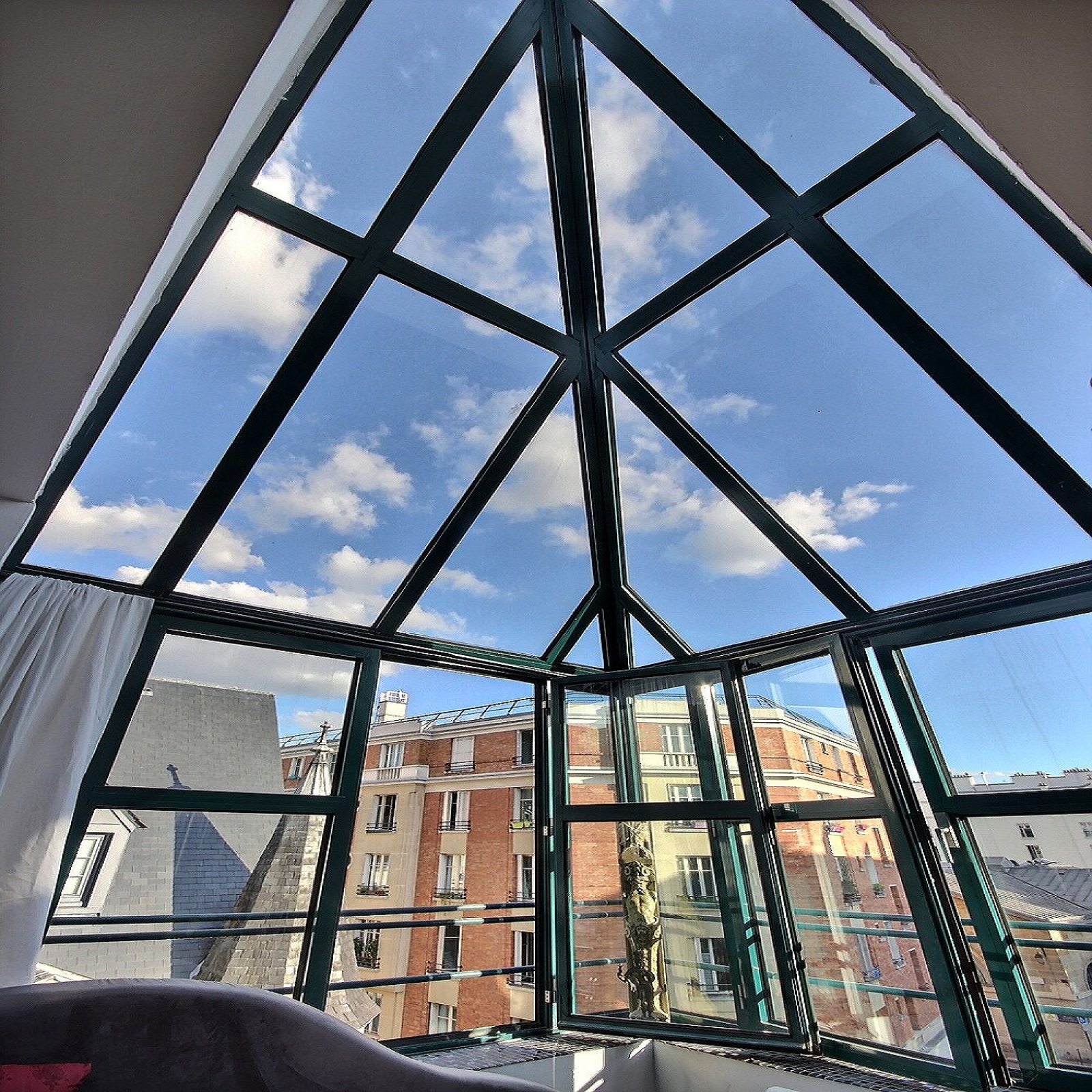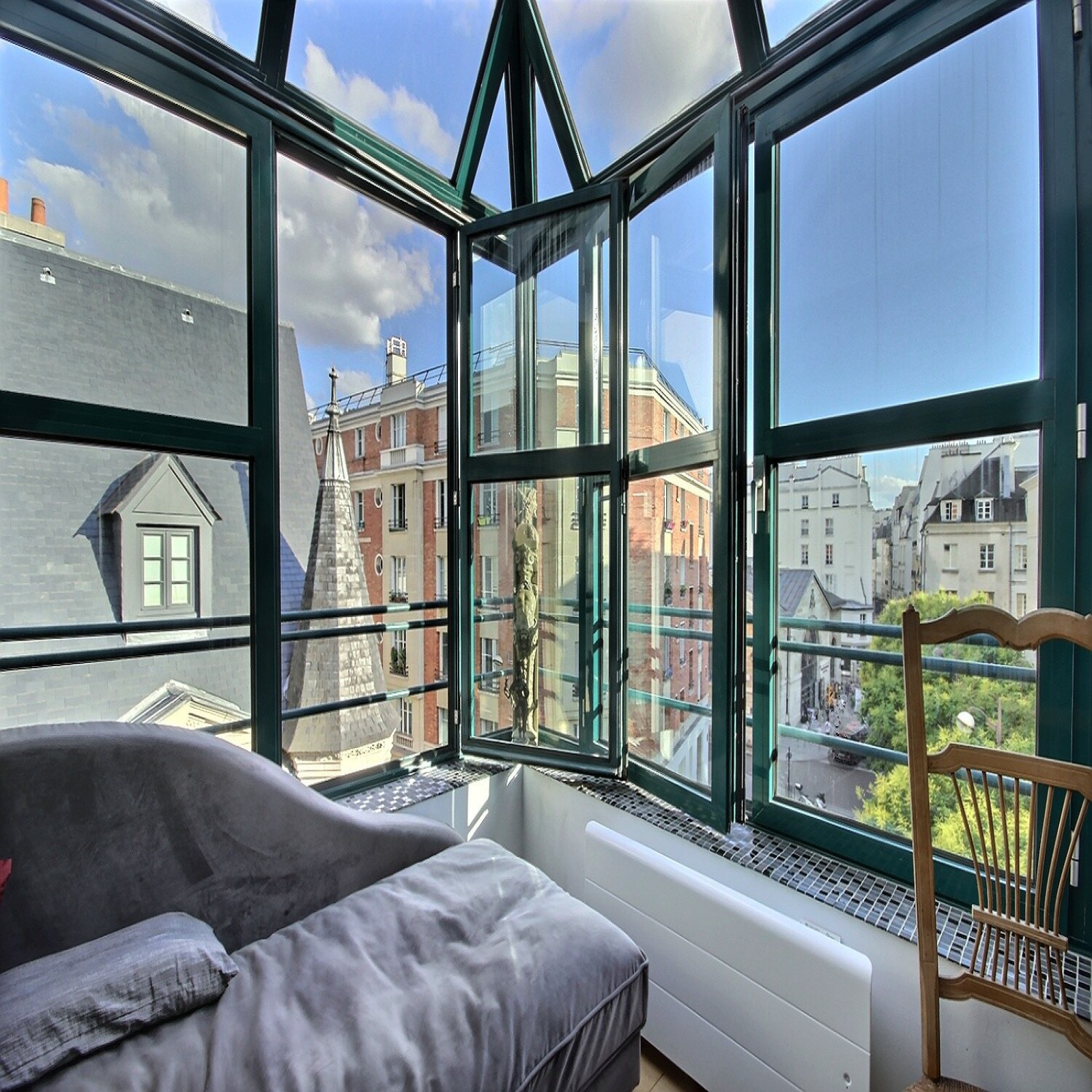 Au Coeur du Marais : Très bel appartement d'angle avec VERRIERE, vue sur un monument et place arborée, rue des Francs Bourgeois et Vieille du Temple, au 4ème étage AVEC ascenseur RATIONNEL 2 pièces de 51m² au sol dont 50,41m² Carrez comprenant : Entrée avec placard, grand séjour avec cette verrière et beau parquet, cuisine séparée par une cloison (donc peut être ouverte) avec fenêtre, chambre avec armoire, grande salle de bains et wc "suspendu" séparé. Possibilité de moduler le plan pour agrandir la chambre et réduire salle de bains ou autres... Double vitrage, radiateur à inertie neuf Noirot et ballon d'eau chaude neuf économique. 1 cave complète ce bien et éventuellement possibilité d'avoir une place de parking à vendre ou à louer dans l'immeuble. Résidence construire en 1987 sur un terrain de la Ville de Paris avec "droit au bail à construction" (bail emphytéotique) qui terminera en 2086, avec redevance de 815€/an.