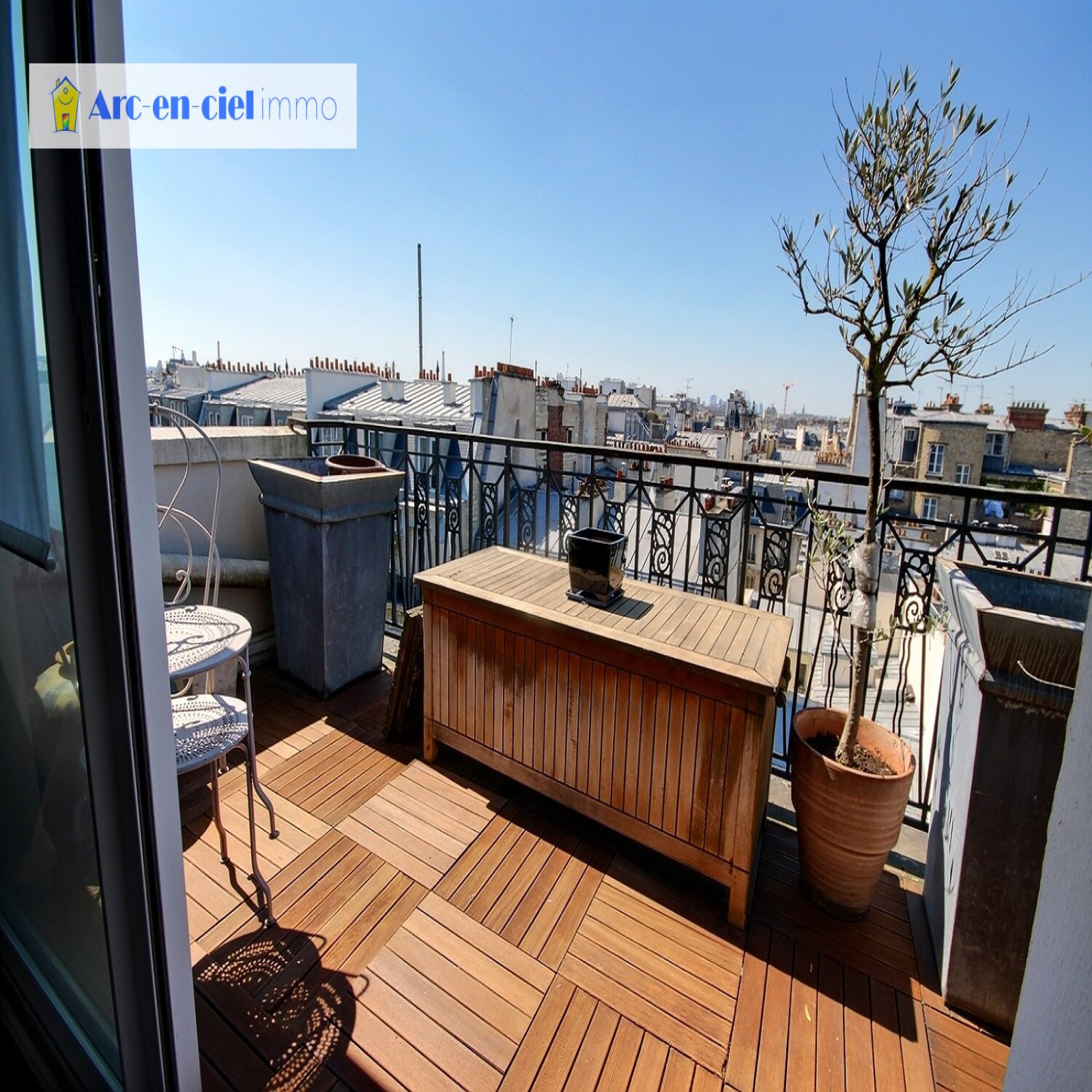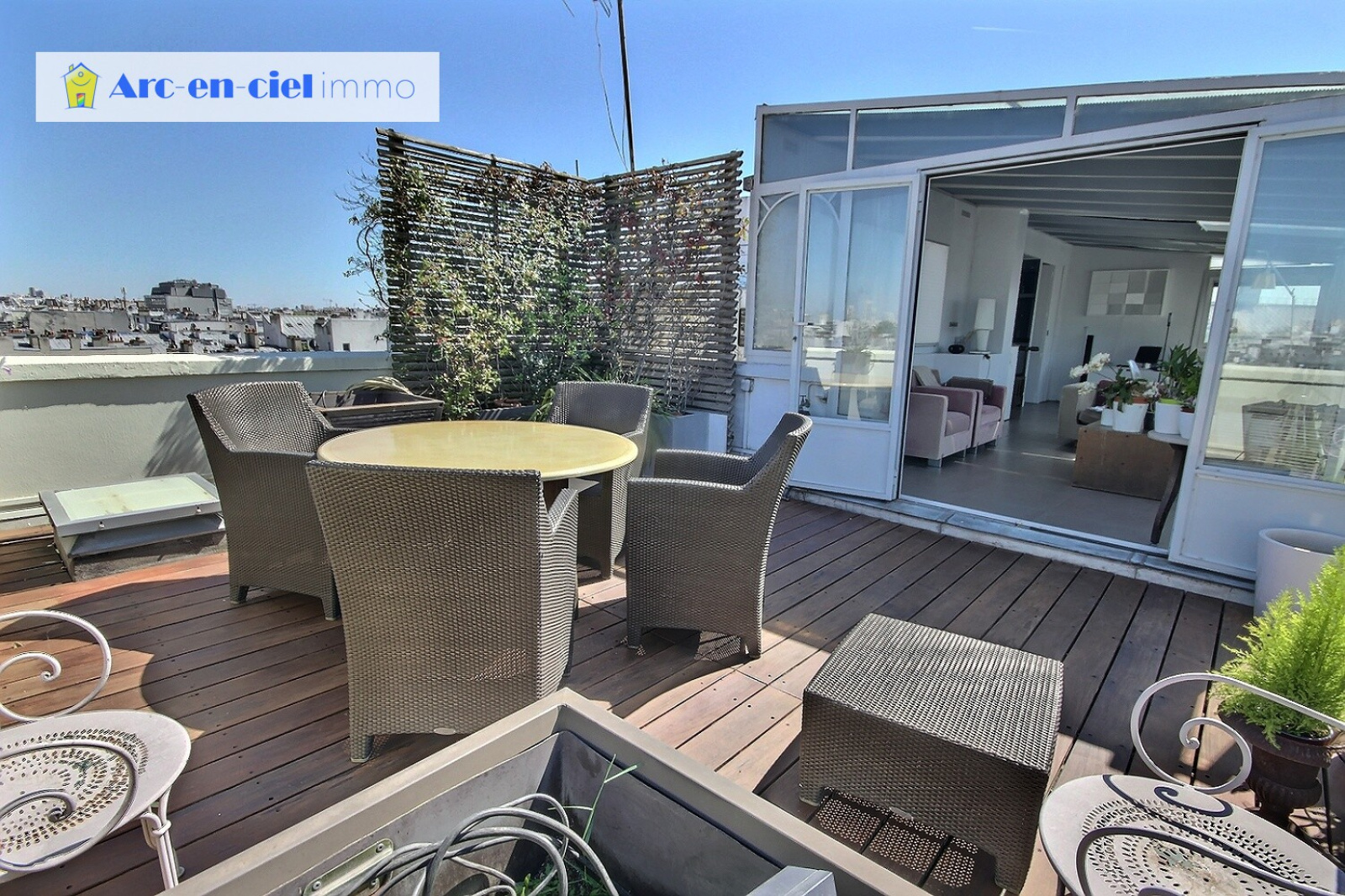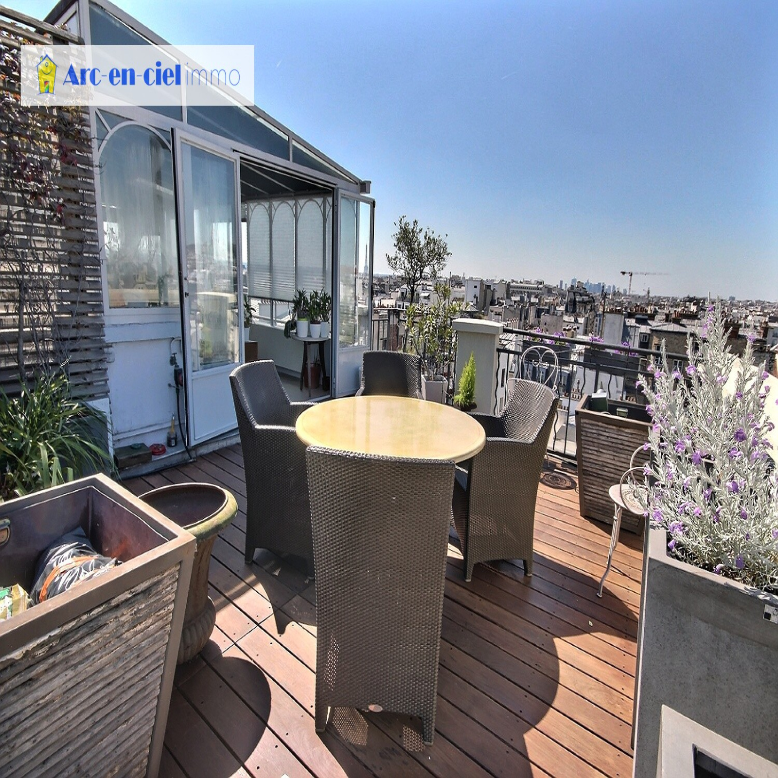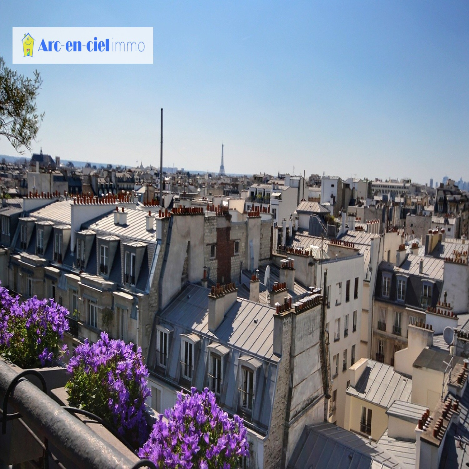 PENTHOUSE (maison sur le toit d'un immeuble) ATYPIQUE et EXCEPTIONNEL DUPLEX inversé AVEC TERRASSES VUES PANORAMIQUES SUR TOUT PARIS situé Rue Bouchardon, une rue "branchée" calme et très agréable, proche métros et des théatres, dans un bel immeuble Art-Déco des années 1930, petite copropriété. Au 8ème et 9ème et dernier étage avec ascenseur du 1er au 7ème, isolé et donc pas de voisin direct sauf en dessous, se trouve cet appartement de 60.35m² au sol (dont 54.40m² Carrez + dressing de 4.5m² non Carrez + embrasures) et 2 TERRASSES : celle du séjour 24,5m² + balcon 1.5m² et la terrasse de la chambre 9m². il comprend, au 8ème étage : entrée, chambre de 17.50m² avec sa terrasse, dressing de 4.5m² (ancien balcon sous verrière donc non Carrez), salle d'eau de 5,10m² avec wc isolé et fenêtre et placard pour machine à laver. Au 9ème étage : SEJOUR de 30m² avec cuisine US tout carrelé et sous verrière avec stores, 4 expositions (Est-Sud-Ouest et Nord), balcon arrondi et sublime TERRASSE avec la vue sur la Tour Eiffel, le Sacré-Coeur etc. Vue époustouflante du séjour et de la terrasse qui vous émerveillera. APPARTEMENT D'EXCEPTION.