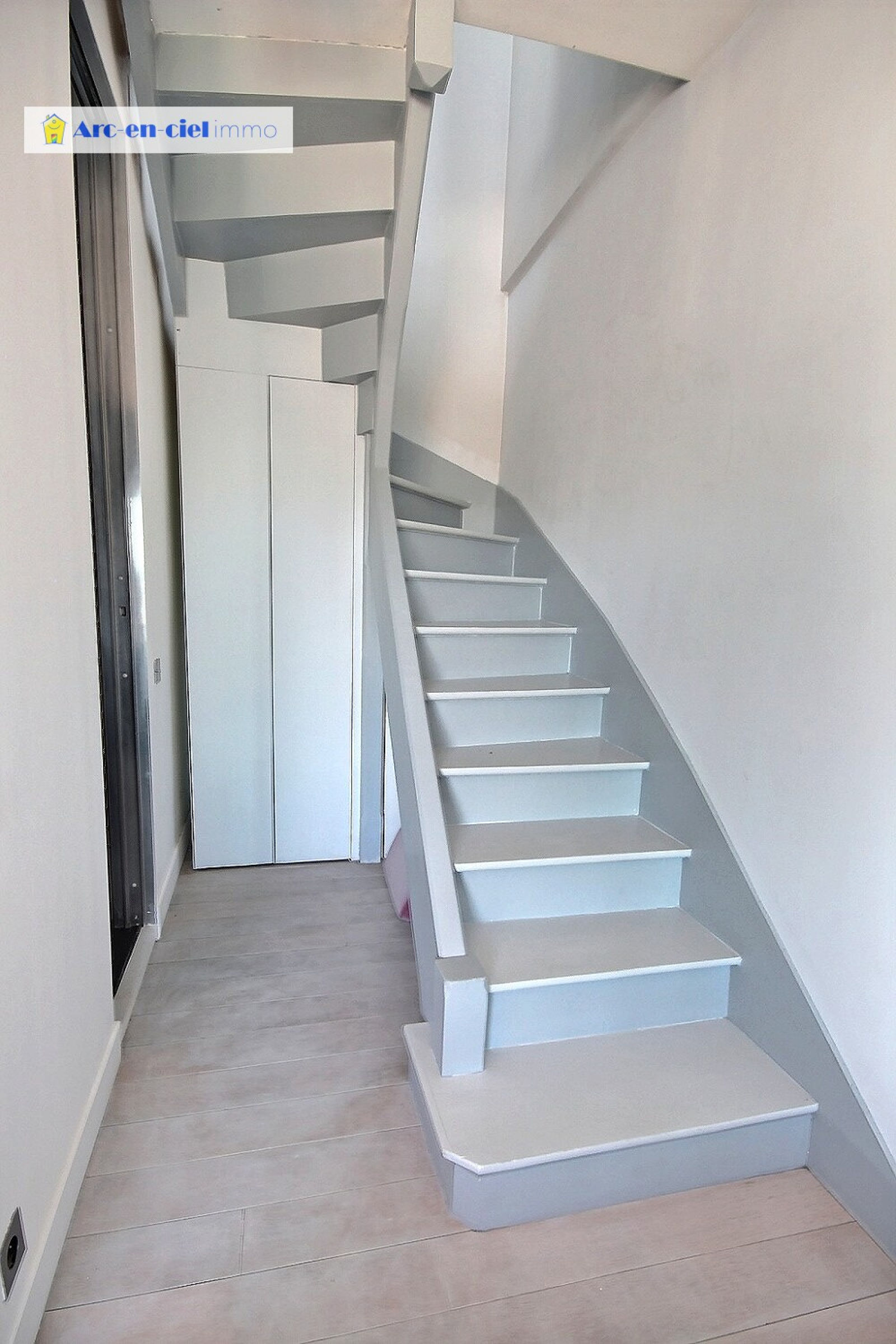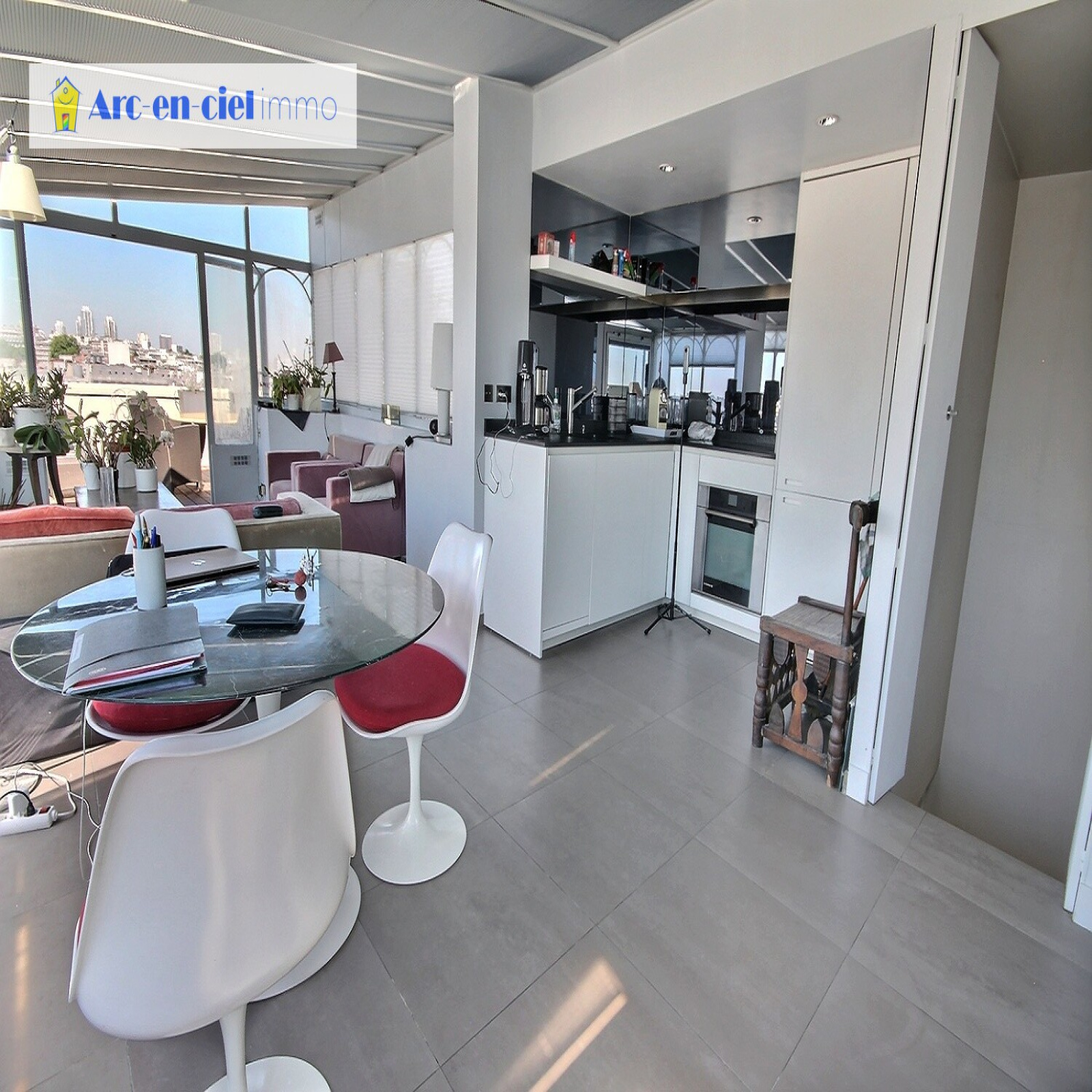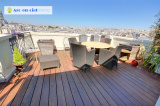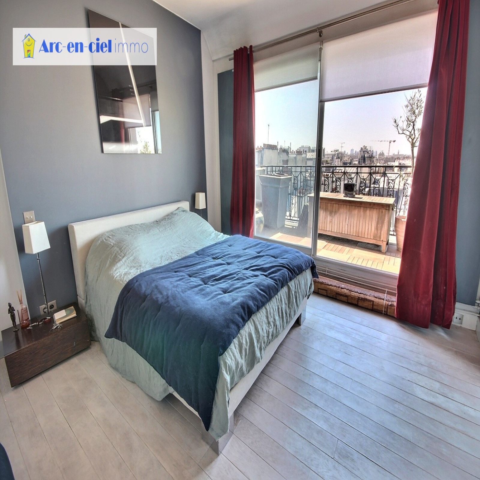 PENTHOUSE (maison sur le toit d'un immeuble) ATYPIQUE et EXCEPTIONNEL DUPLEX inversé AVEC TERRASSES VUES PANORAMIQUES SUR TOUT PARIS situé Rue Bouchardon, une rue "branchée" calme et très agréable, proche métros et des théatres, dans un bel immeuble Art-Déco des années 1930, petite copropriété. Au 8ème et 9ème et dernier étage avec ascenseur du 1er au 7ème, isolé et donc pas de voisin direct sauf en dessous, se trouve cet appartement de 60.35m² au sol (dont 54.40m² Carrez + dressing de 4.5m² non Carrez + embrasures) et 2 TERRASSES : celle du séjour 24,5m² + balcon 1.5m² et la terrasse de la chambre 9m². il comprend, au 8ème étage : entrée, chambre de 17.50m² avec sa terrasse, dressing de 4.5m² (ancien balcon sous verrière donc non Carrez), salle d'eau de 5,10m² avec wc isolé et fenêtre et placard pour machine à laver. Au 9ème étage : SEJOUR de 30m² avec cuisine US tout carrelé et sous verrière avec stores, 4 expositions (Est-Sud-Ouest et Nord), balcon arrondi et sublime TERRASSE avec la vue sur la Tour Eiffel, le Sacré-Coeur etc. Vue époustouflante du séjour et de la terrasse qui vous émerveillera. APPARTEMENT D'EXCEPTION.