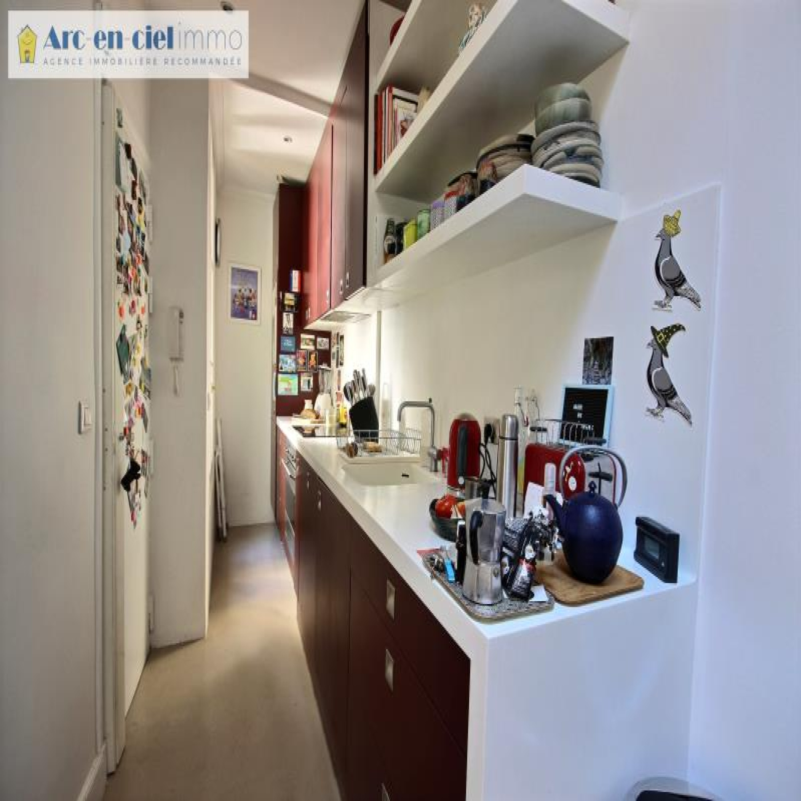 Style LOFT, sympathique et atypique appartement de caractère. Rue du Grand Prieuré, métro Oberkampf, proche République, Canal et quartier du Haut Marais. Dans un immeuble en façade Pierre de taille, sur le bâtiment cour paysagée au grand calme. Au 2ème étage : 67,05m² Carrez avec grandes hauteurs sous plafond, VERRIERE. Appartement en forme de U, composé d'un vaste séjour et 2,90m de hauteur sous plafond, sous les combles, éclairé par fenêtre sur cour avec sa chambre en vis à vis, et 2 grands velux électriques, très lumineux, sol en béton ciré ; cuisine ouverte sur séjour (dans l'entrée) toute équipée avec plan de travail en Corian ; Bureau-bibliothèque de 8m² sous verrière donnant le passage à l'immense chambre de 23m² de parquet et 2,75m de hauteur sous plafond, de nombreux placards ; salle de bains avec fenêtre et baignoire Stark ; wc séparé avec fenêtre. 1 grande cave voutée et isolée. Idéal pour musiciens, artistes, etc. Non familial. Coup de foudre. A voir rapidement. ~Copropriété : 23 lots dont 19 lots principaux. Quote-part budget prévisionnel annuel : 1708 €. Classe d'énergie E. Prix affiché honoraires inclus à 4% TTC. Arc-en-ciel Immo agence à honoraires réduits.