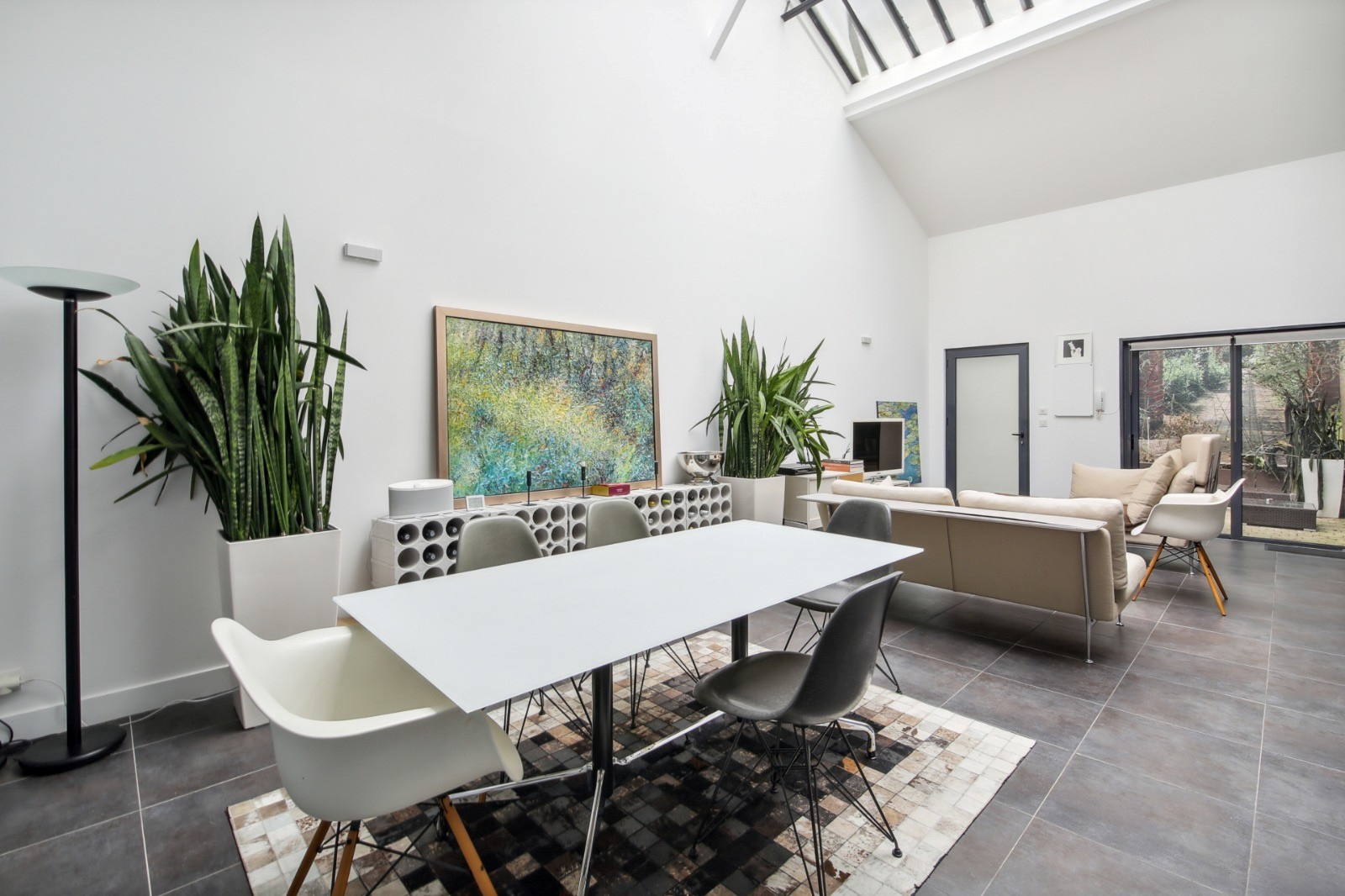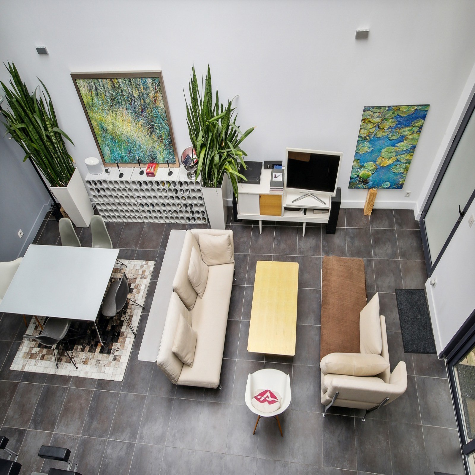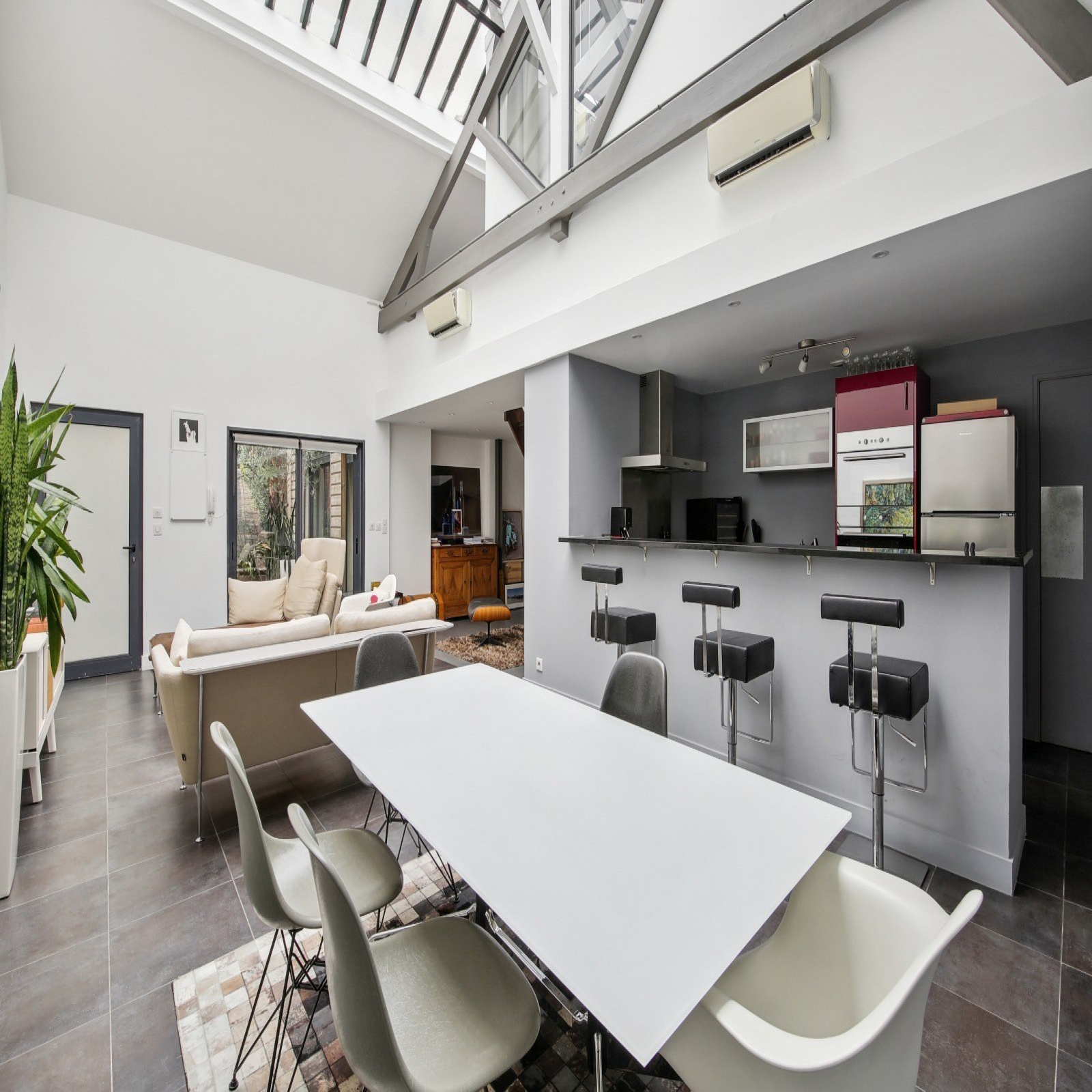 A 5mn à pied du métro Stade, RER D et bus, quartier pavillonnaire recherché "Charentonneau" Avenue Gambetta, dans bel immeuble industriel transformé en lofts, celui-ci de 125m² au sol dont 112.41m² Carrez soit 119m² pondéré +18m² de grenier, au calme sur cour arrière et son grand volume avec verrière et sa terrasse en jouissance privative d'environ 15m² donnant sur le vaste séjour de 65m² et hauteur sous plafond jusqu'à 6m avec charpente métallique et bois (à l'origine séjour double et 3ème chambre) Cuisine à l'Américaine toute équipée sous mezzanine, buanderie de 5,25m², grande chambre parentale de 17m² équipée de grands placards aménagés et donnant aussi sur la terrasse, salle d'eau avec douche à l'Italienne et WC. A l'étage mezzanine pouvant servir de bureau 6,10m², grande chambre de 15.35m² et dressing de 6,10m², 2ème salle d'eau avec wc. Climatisation réversible, volets électriques, parfaitement isolé avec un bon DPE. En parfait état, plan modulable. Avec 1 place de parking couverte (accès rdch) et 2ème place en option et local vélos.