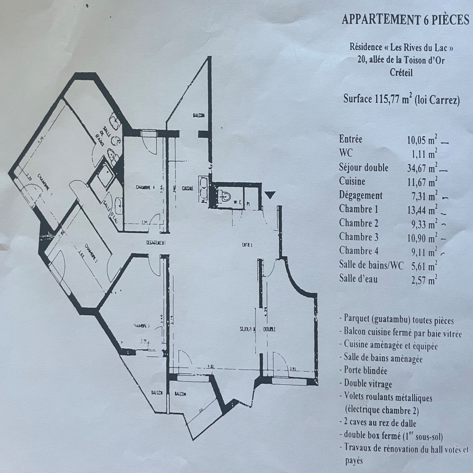 Résidence de la Toison d'Or de 1980 au 3ème étage avec VUE SUR LE LAC, TRES CALME, proche métro Créteil Préfecture et Centre Commercial, ce grand 6 pièces de 115,63m² Carrez comprenant : Belle entrée avec dressing et placard, wc indépendant avec lave mains, vaste séjour de 35m² avec balcon à l'Ouest et vue sur le lac sans vis à vue et salle à manger (pouvant être séparée pour faire 5ème chambre), belle cuisine équipée avec bar et cellier, 4 chambres dont 1 suite parentale avec sa propre salle d'eau avec 2ème wc, et une des chambres à sa loggia fermée par baie vitrée, 2ème salle d'eau. Porte blindée, double vitrage, volets roulants métalliques, 2 CAVES ET DOUBLE BOX FERME.